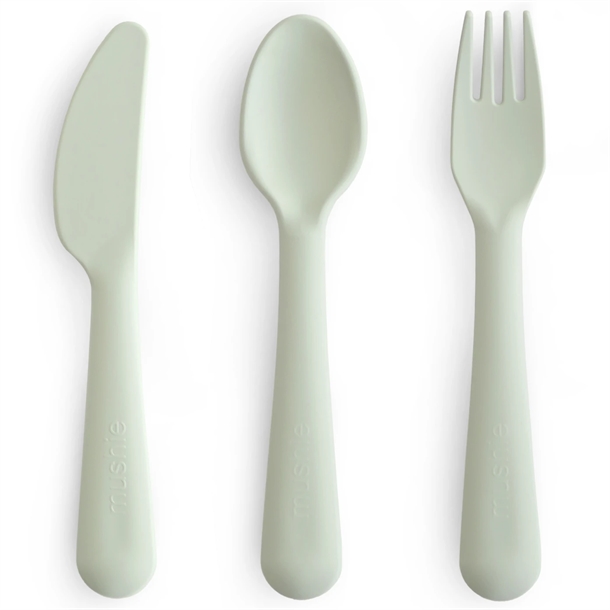 Flot og stilrent Mushie bestiksæt i flot, støvet grøn.