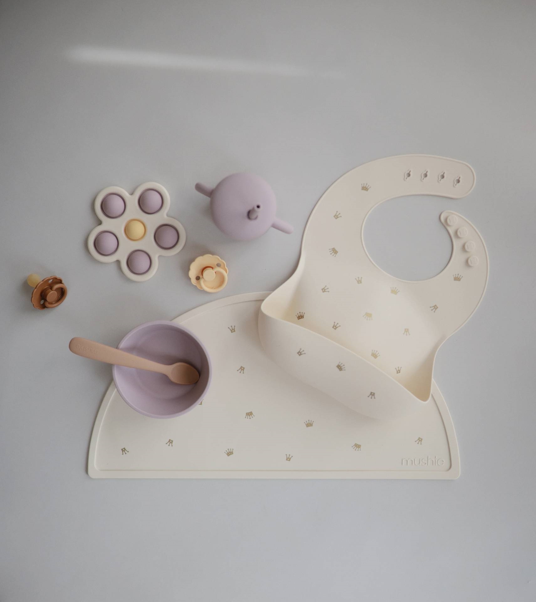 En flot og praktisk Mushie dækkeserviet i beige med et superfint print af små guldfarvede kroner.
