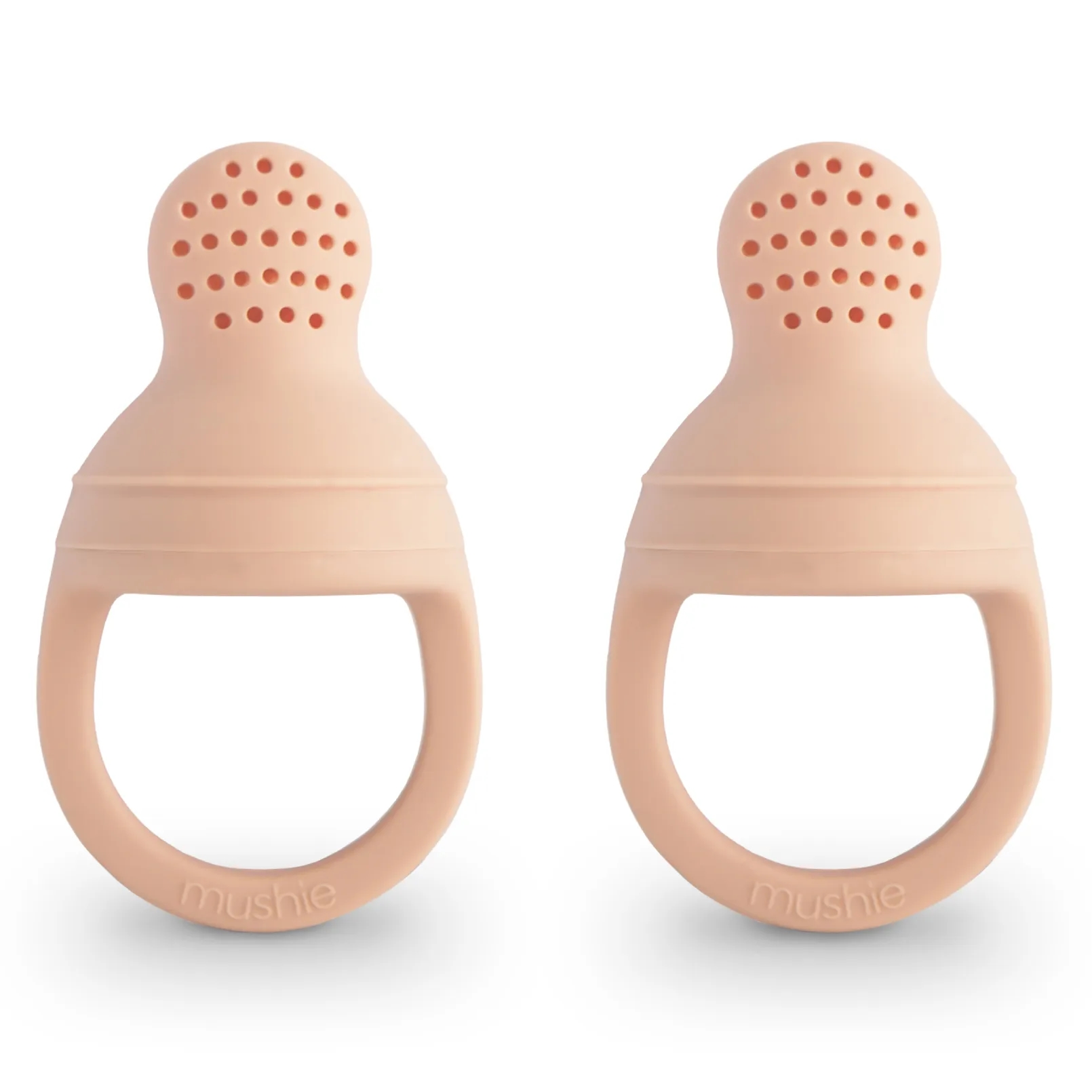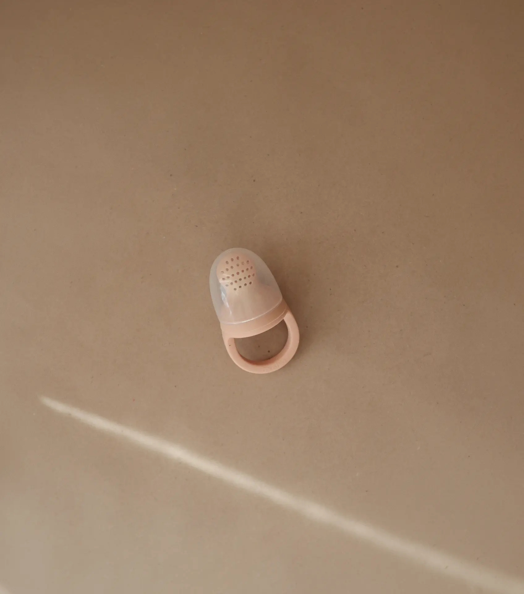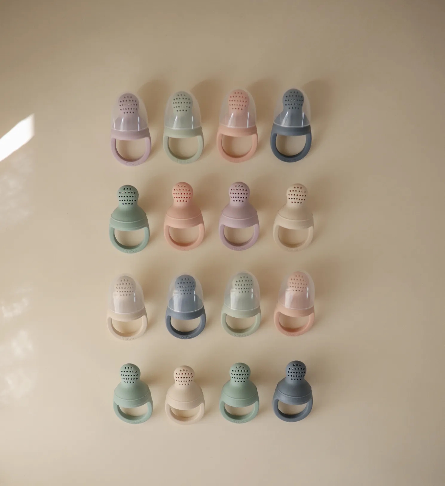 En Mushie food feeder er lavet til at introducere små smagsprøver af frugt og grøntsager til babyer, der er klar til fast føde.