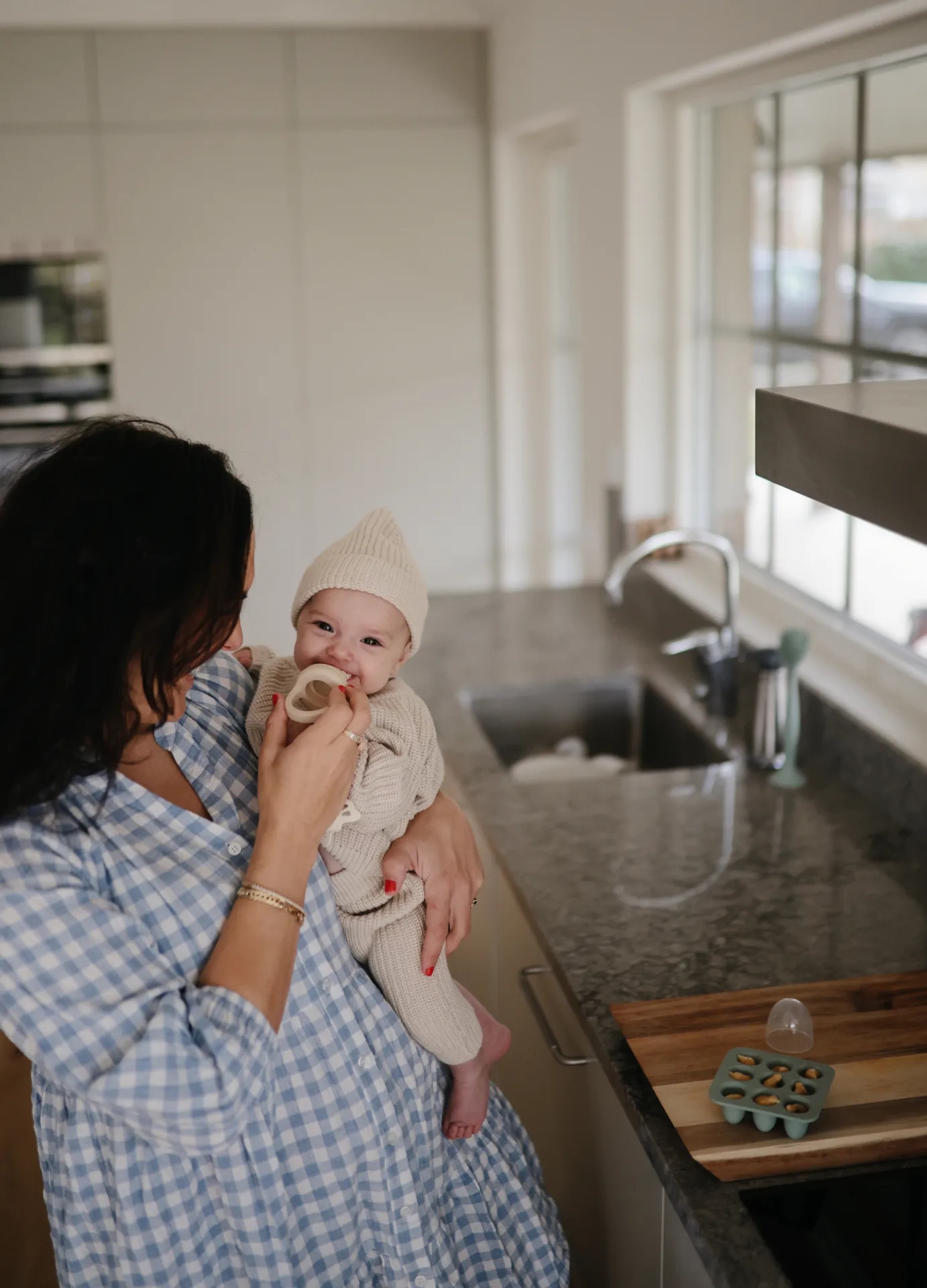 En Mushie food feeder er lavet til at introducere små smagsprøver af frugt og grøntsager til babyer, der er klar til fast føde.