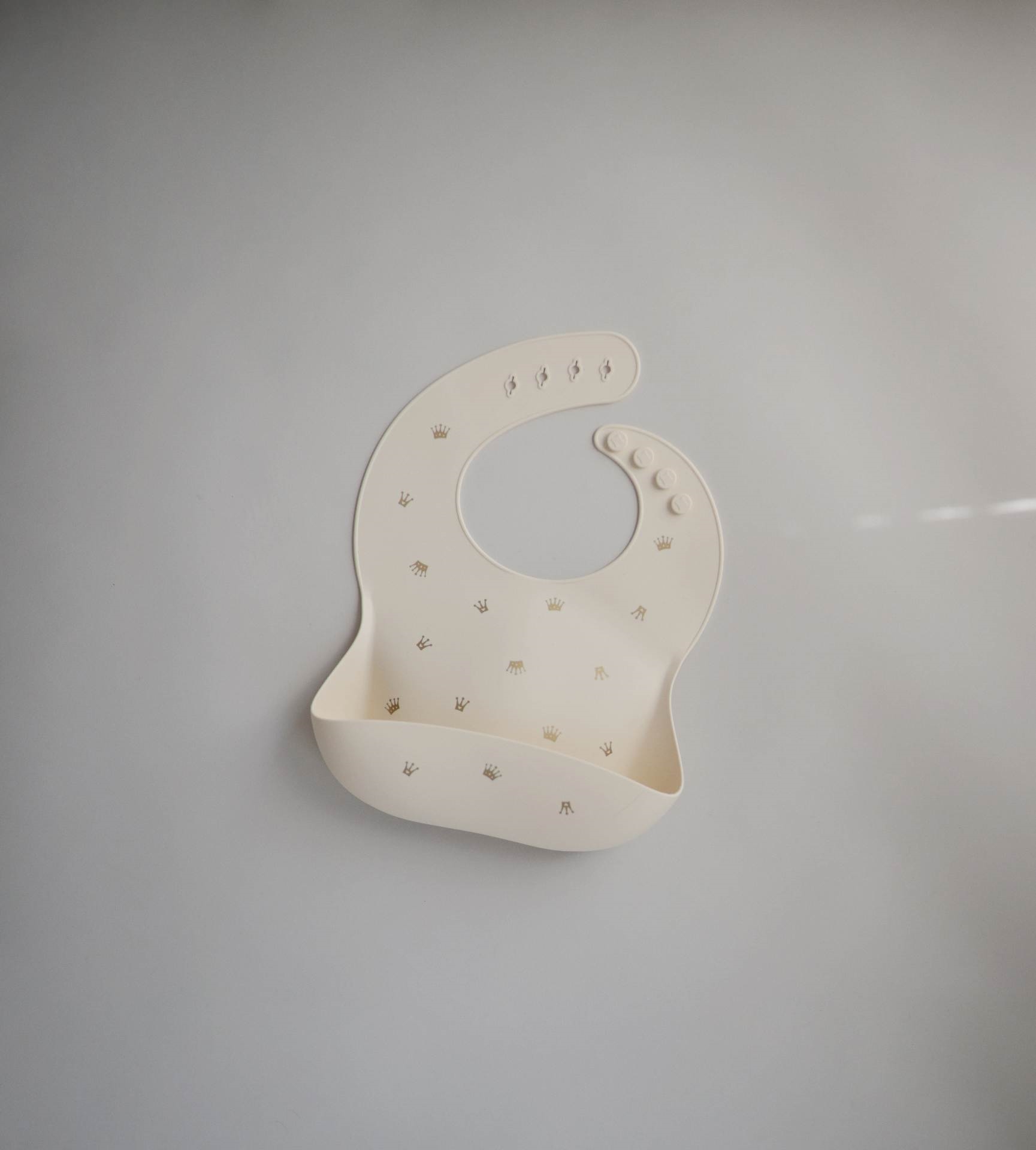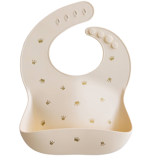Mushie hagesmækken er i en flot lys farve med et superfint print af små guldfarvede kroner.