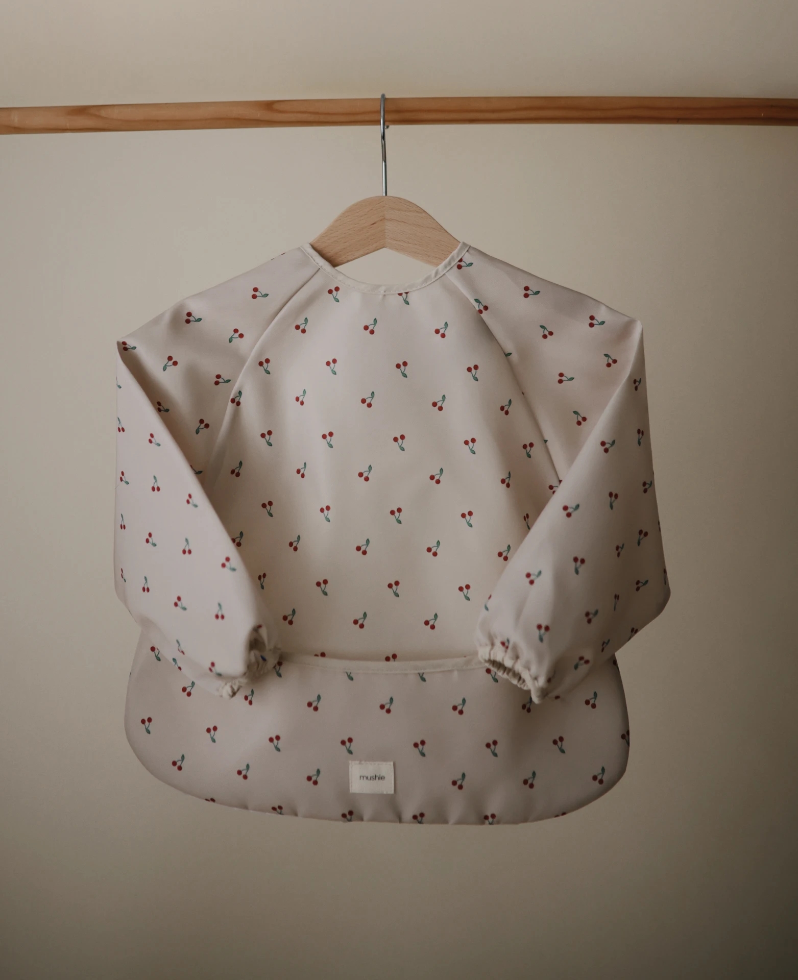 En praktisk Mushie hagesmæk med ærmer til at gribe spildt mad og drikke.