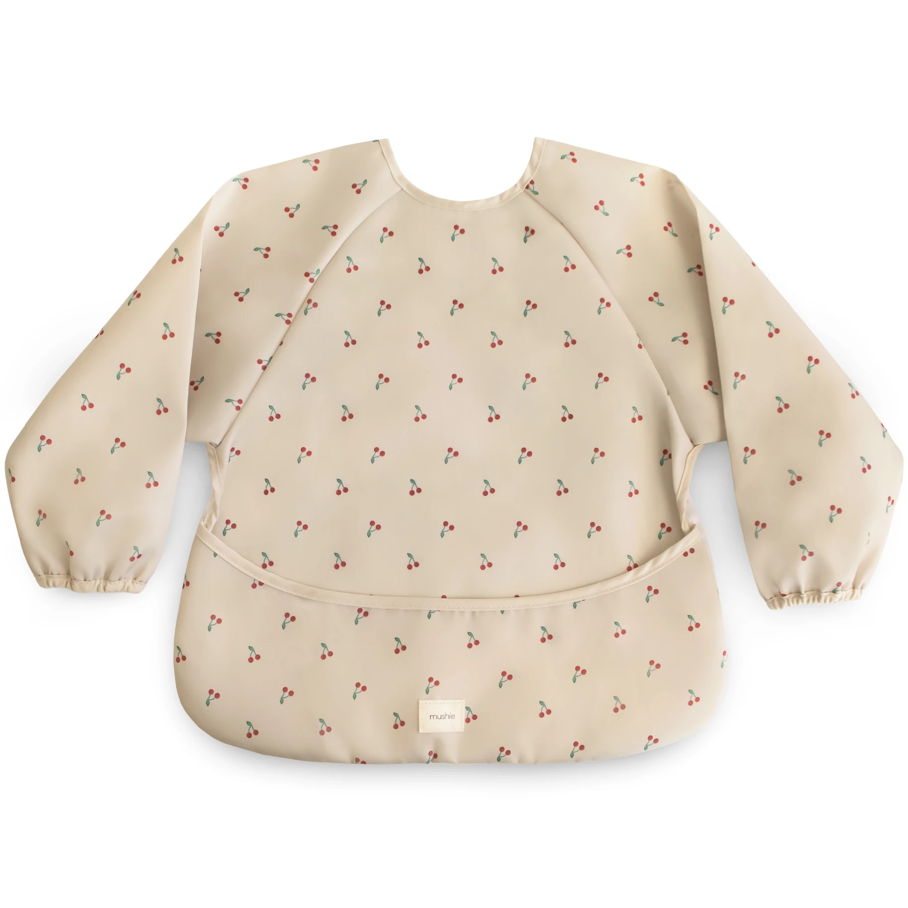 En flot og praktisk Mushie hagesmæk med ærmer til at gribe spildt mad og drikke.