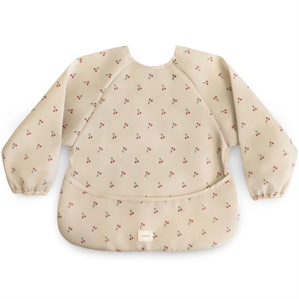 Mushie hagesmækken er beige med et fint print af små kirsebær.