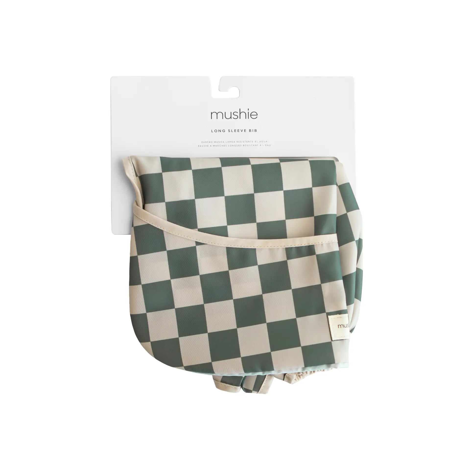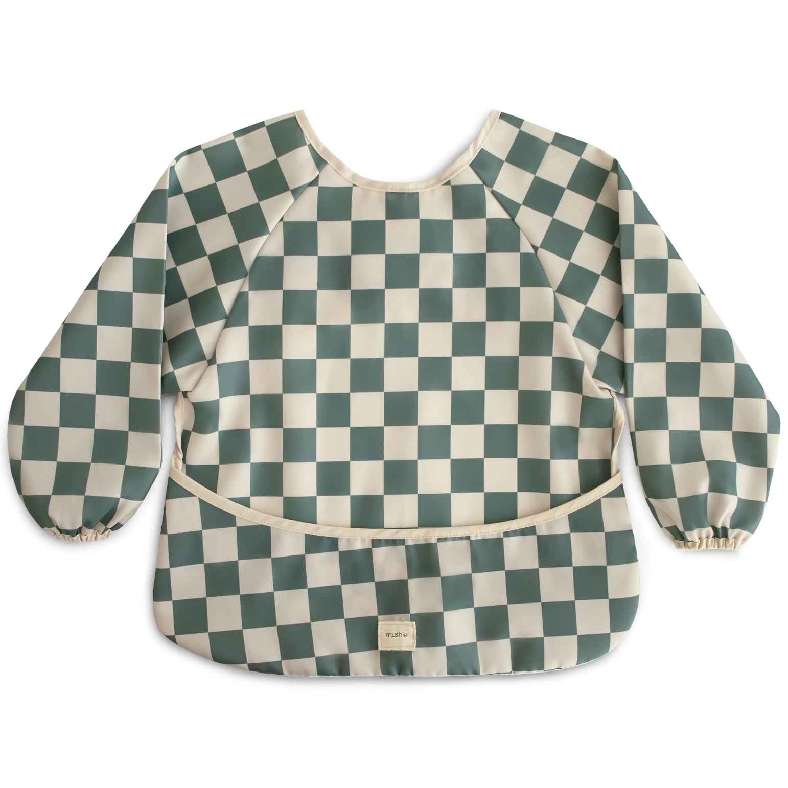 En praktisk Mushie hagesmæk med ærmer til at gribe spildt mad og drikke.