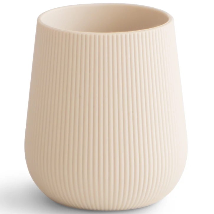 Derudover har børnekoppen et æstetisk design med en ydre ribbet tekstur, som giver et bedre greb. Koppen har en tungere base, som gør, ar den står godt på bordet.