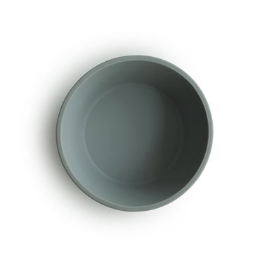 Mushie skål i blød silikone med smart sugekop på bagsiden, så skålen kan sættes fast på bordpladen.
