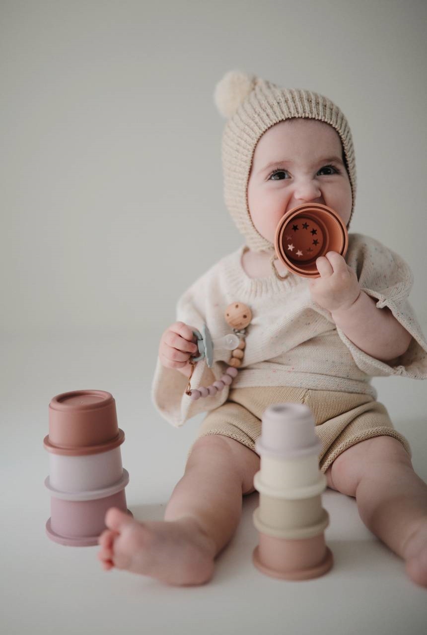 Mushie stablekopper er perfekt til de første stablelege på gulvet og egner sig desuden perfekt til udendørs sand- og vandleg.