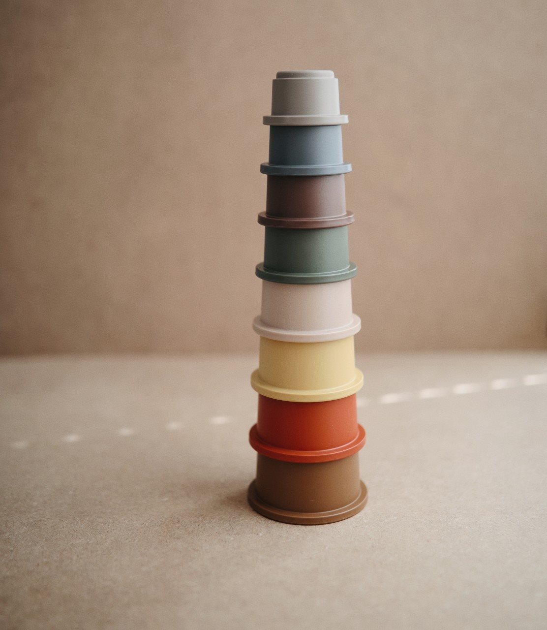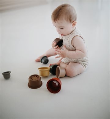 Mushie stablekopper er perfekt til de første stablelege på gulvet og egner sig desuden perfekt til udendørs sand- og vandleg.