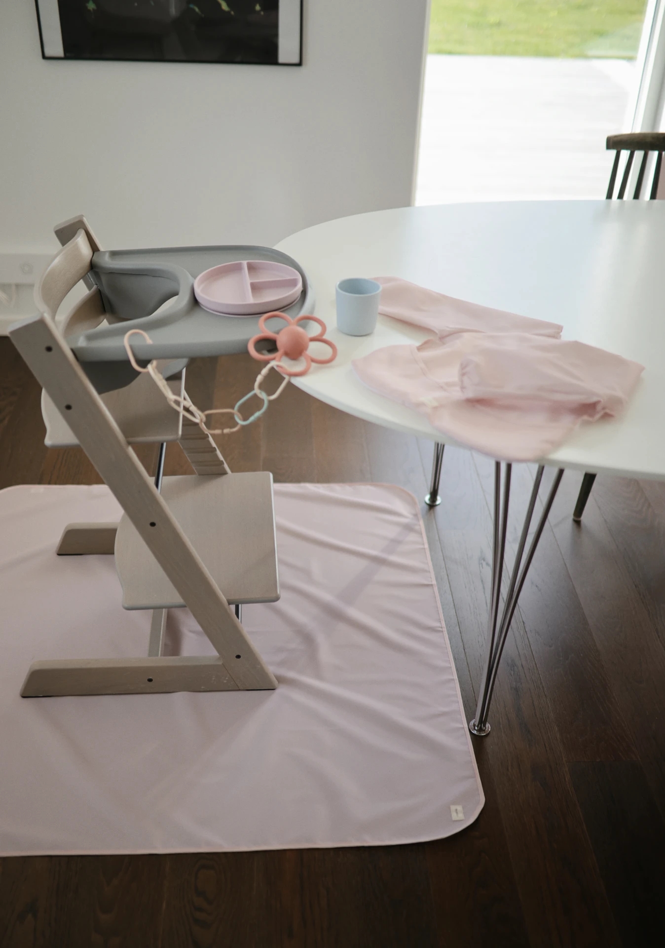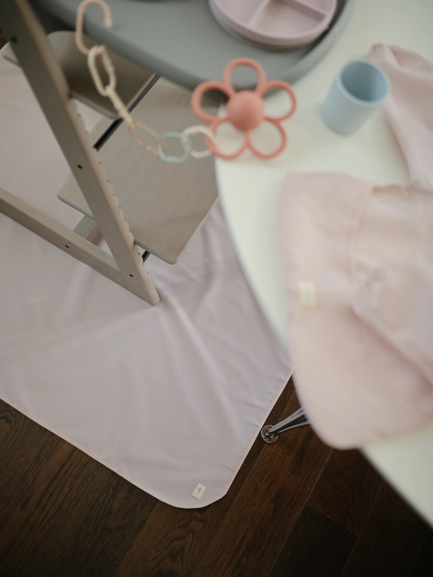 Mushie stoleunderlaget er rosa og måler 108 x 108 cm. Det er perfekt som underlag til højstol.