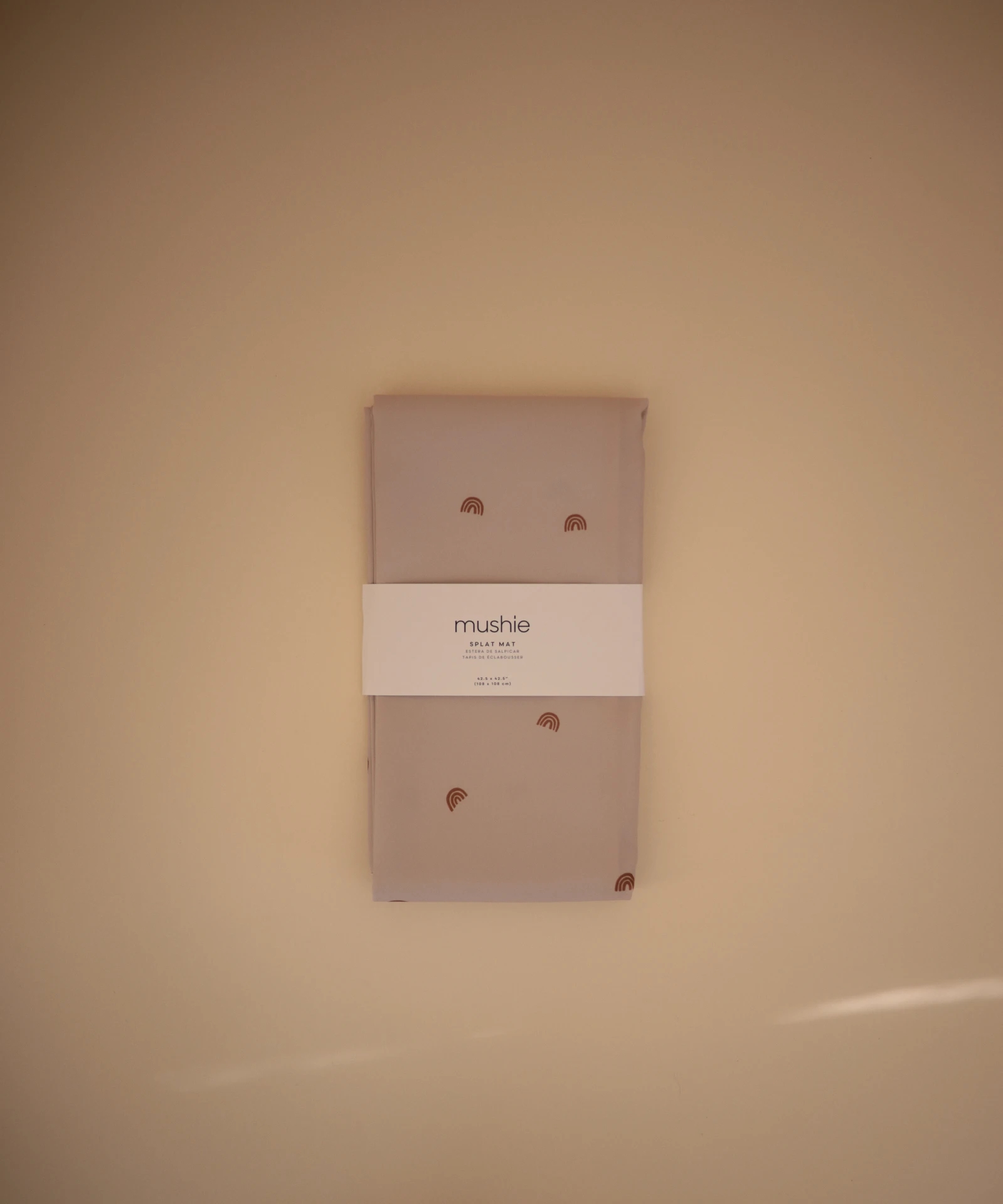 En flot og praktisk Mushie dækkeserviet i med et superfint print med små fine regnbuer.