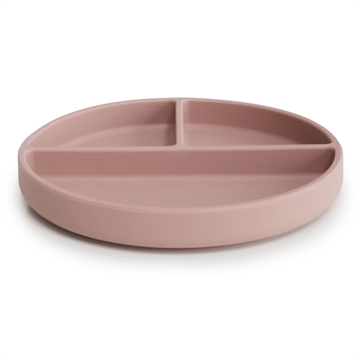 Praktisk Mushie tallerken med sugekop lavet i silikone i flot, støvet rosa.