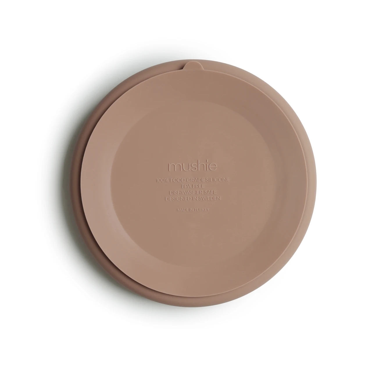 Mushie tallerken med sugekop lavet i silikone i beige-brun nuance.