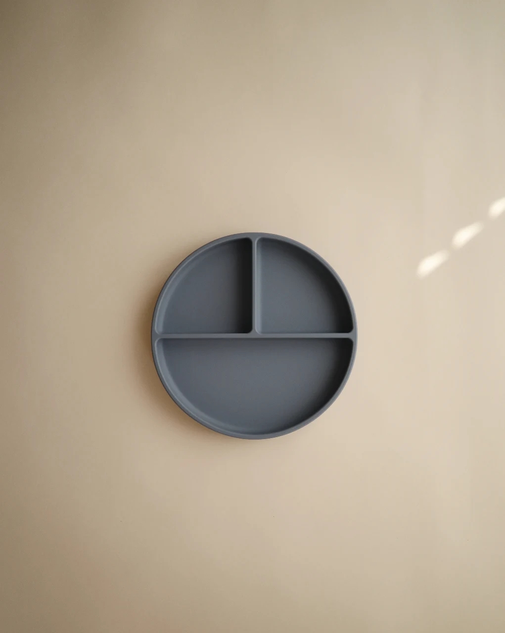 Flot Mushie tallerken med sugekop lavet i silikone i flot, mørkeblågrå farve.