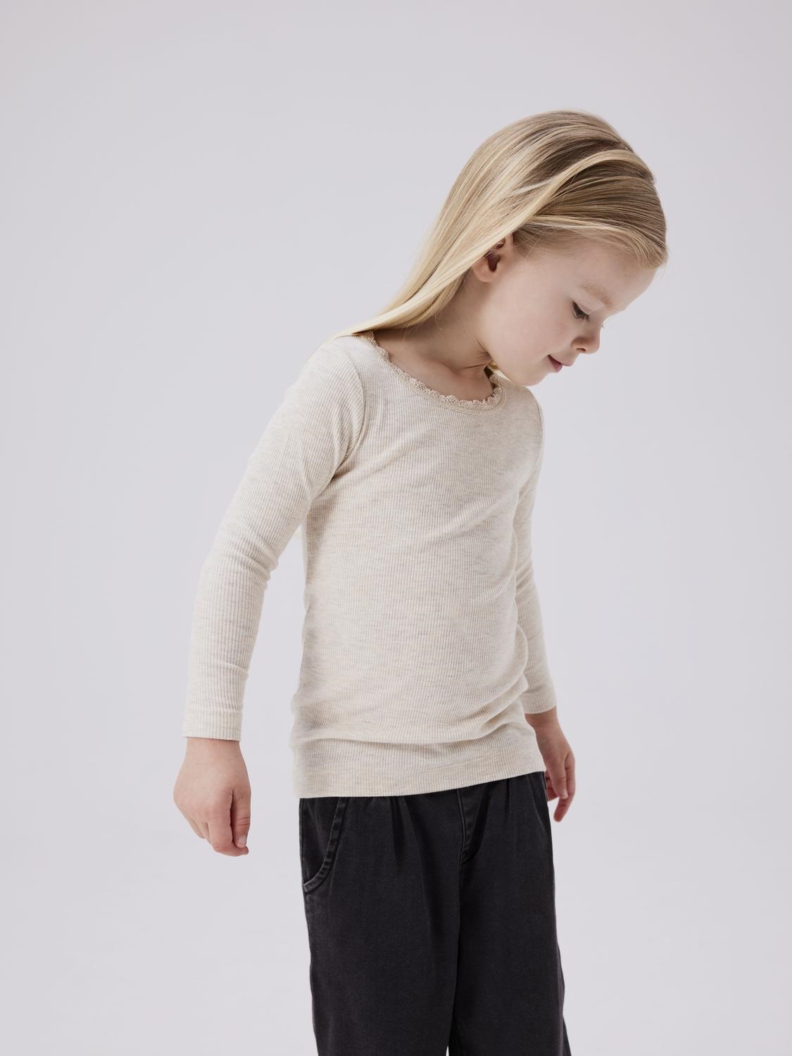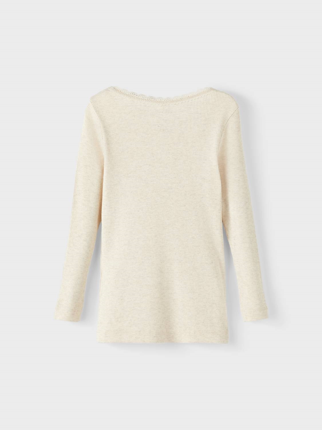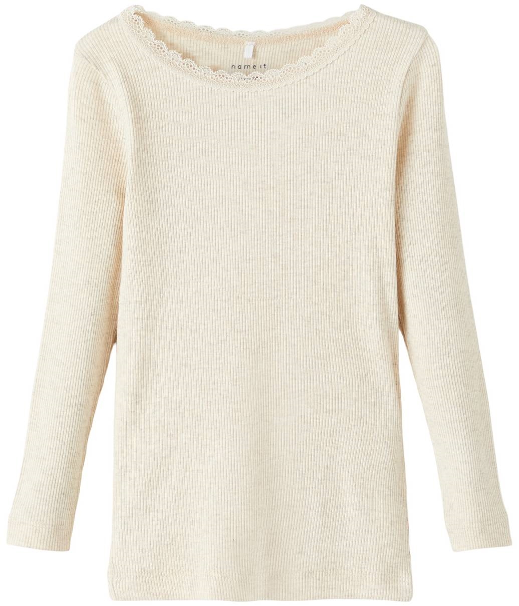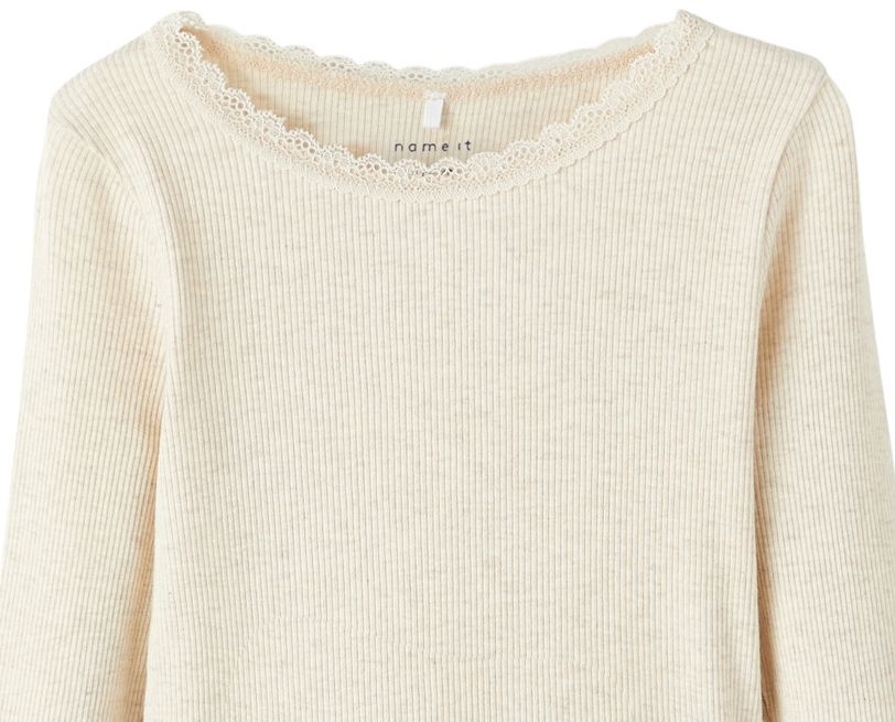 Name It blusen er i en lys beige farve med rib og en sød lille blondekrave.