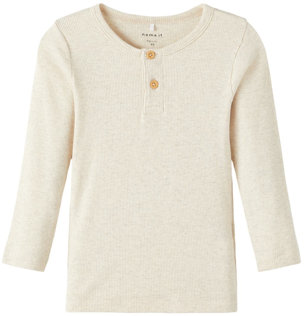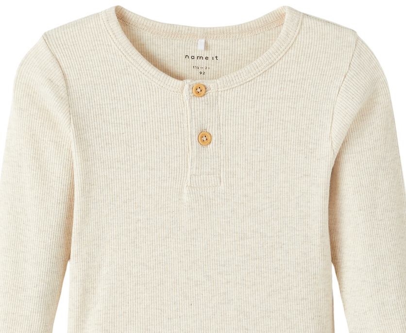 Name It blusen har lange ærmer og en rund halsåbning med stolpelukning, som åbnes med to knapper.