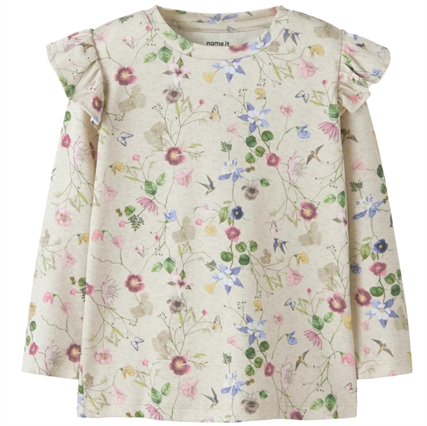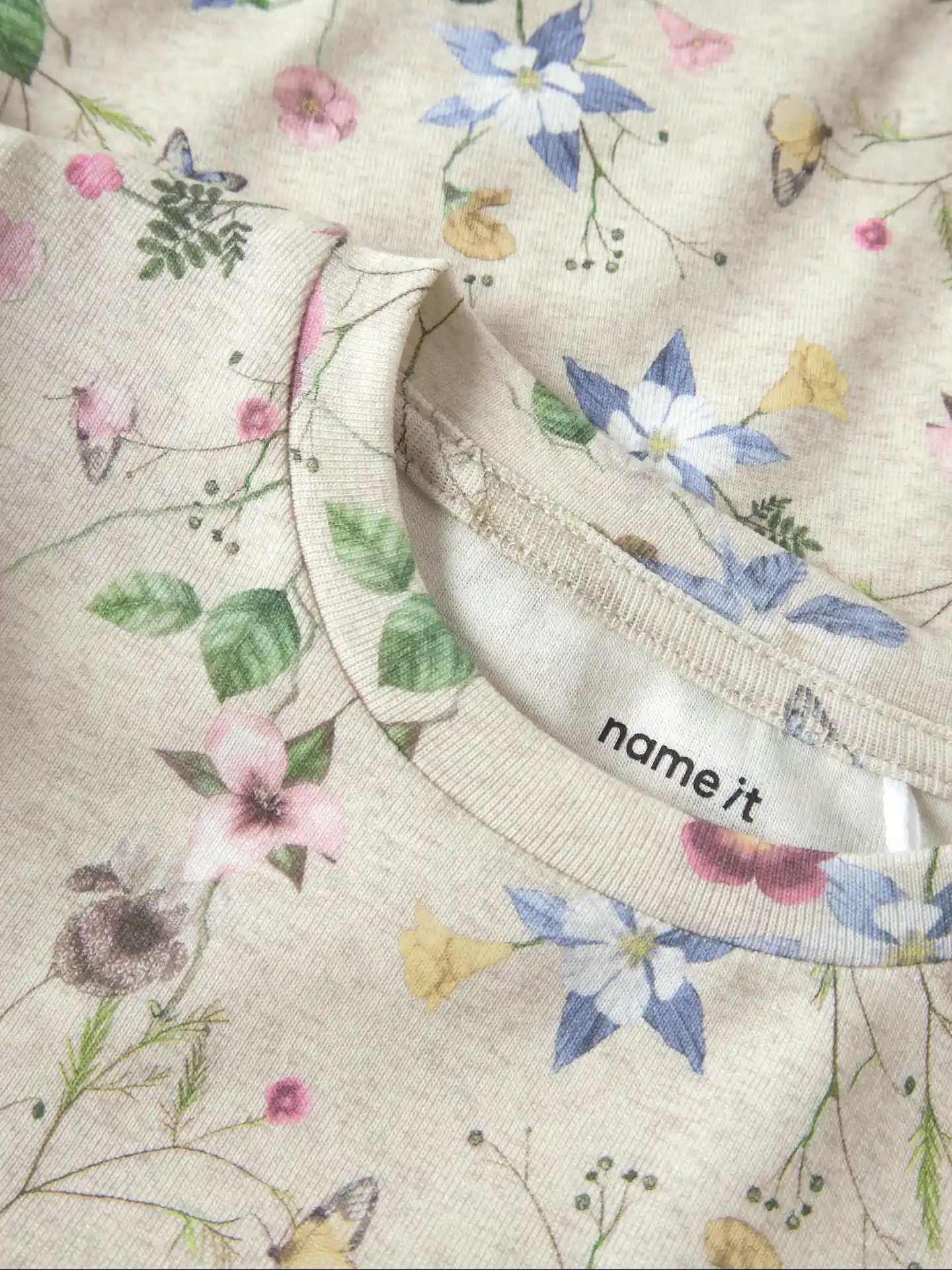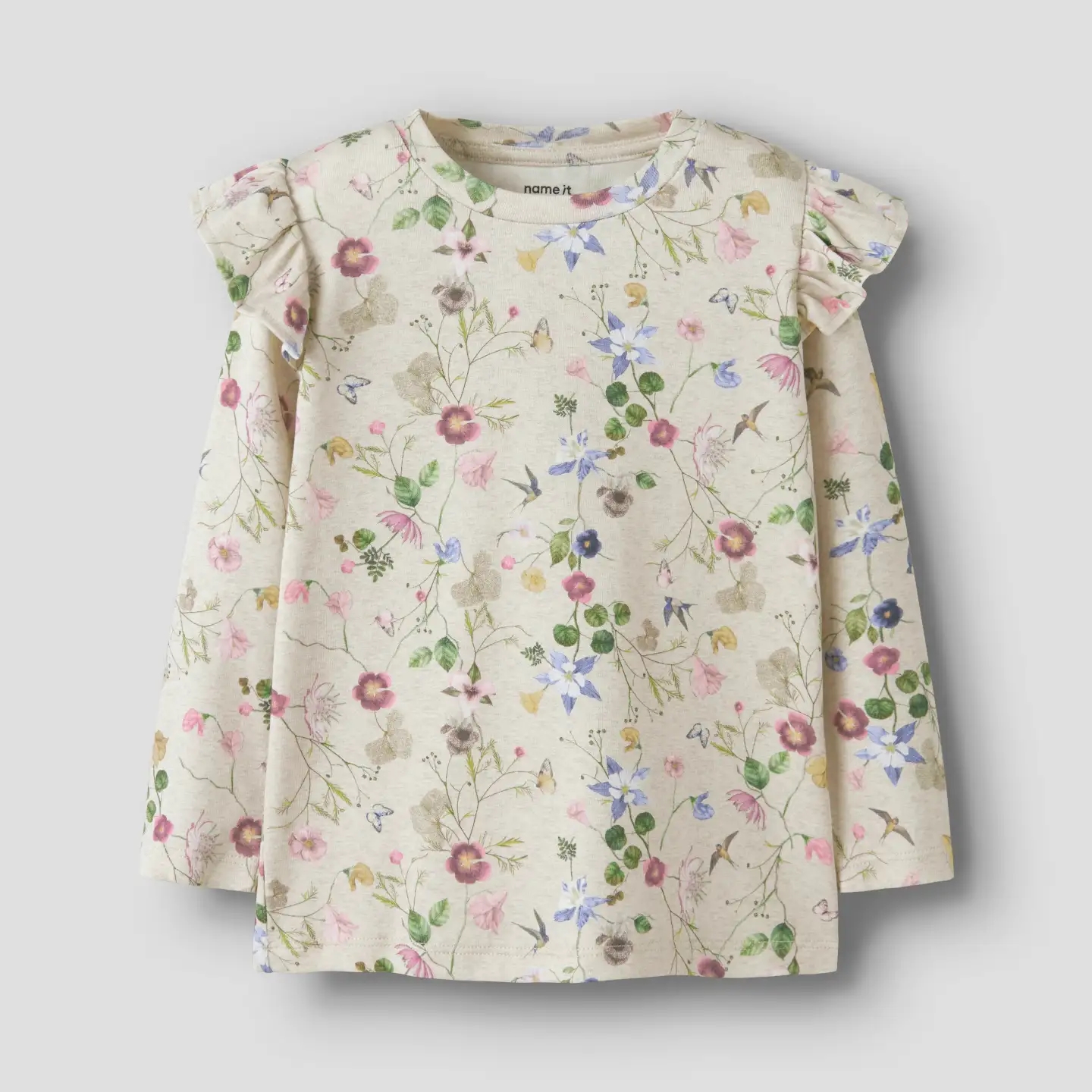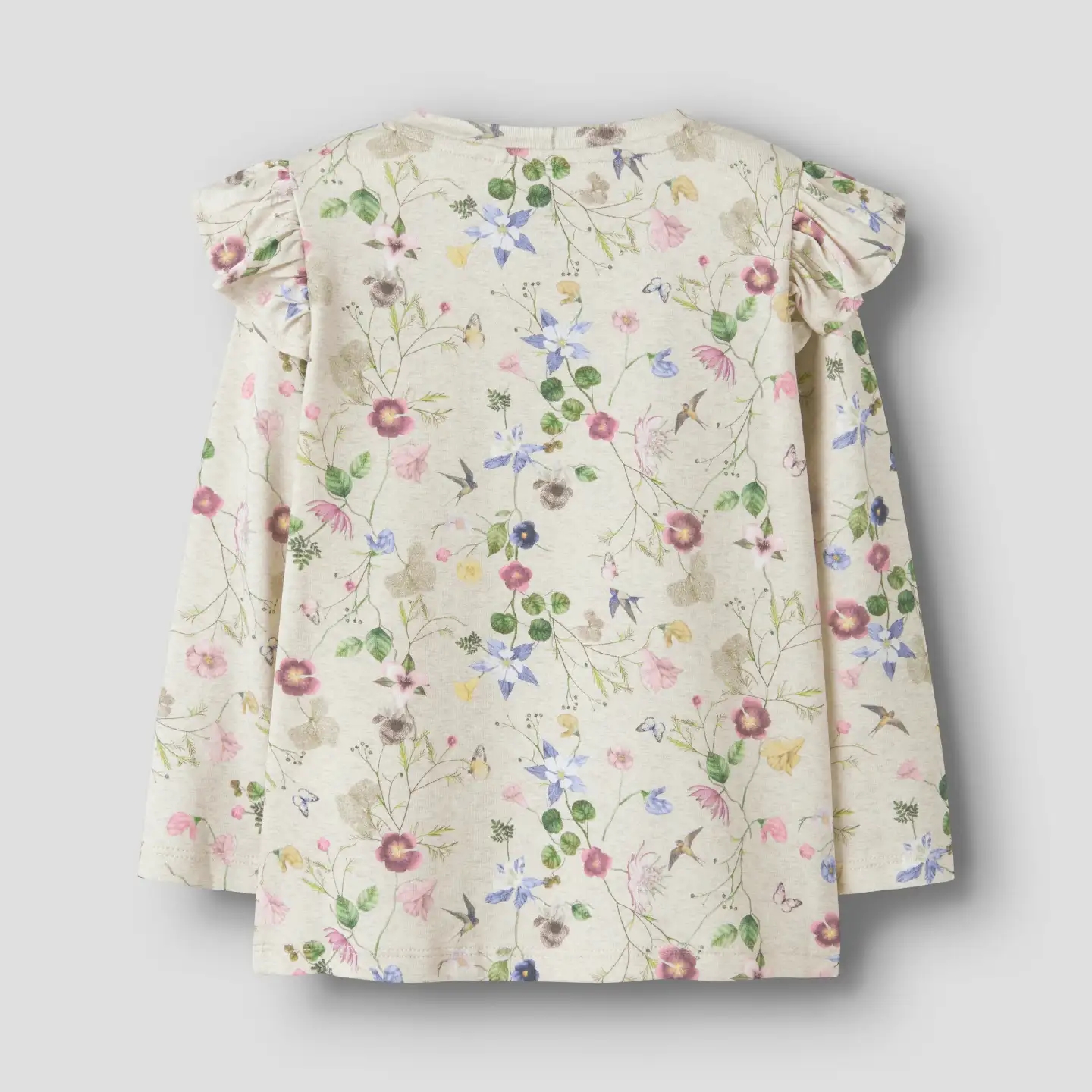 En sød Name It bluse med et fint print af blomster, blade og sommerfugle i rosa, lilla, grønne og gule farver.