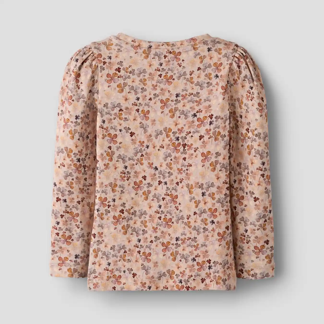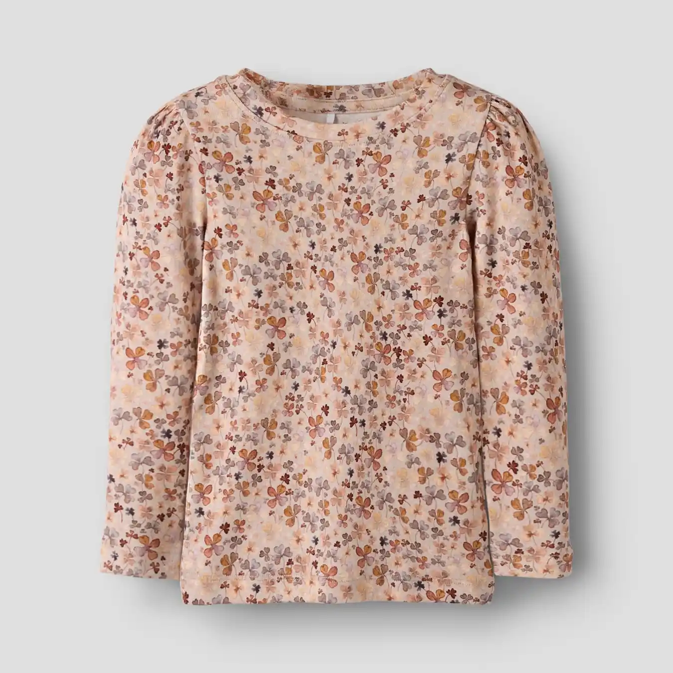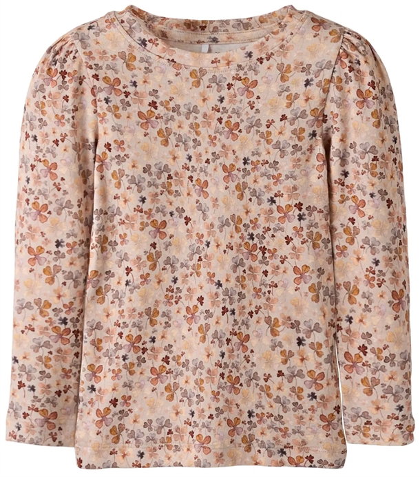 En flot Name It bluse i en varm, lys farve med blomsterprint i skønne, gyldenbrune og lilla nuancer.