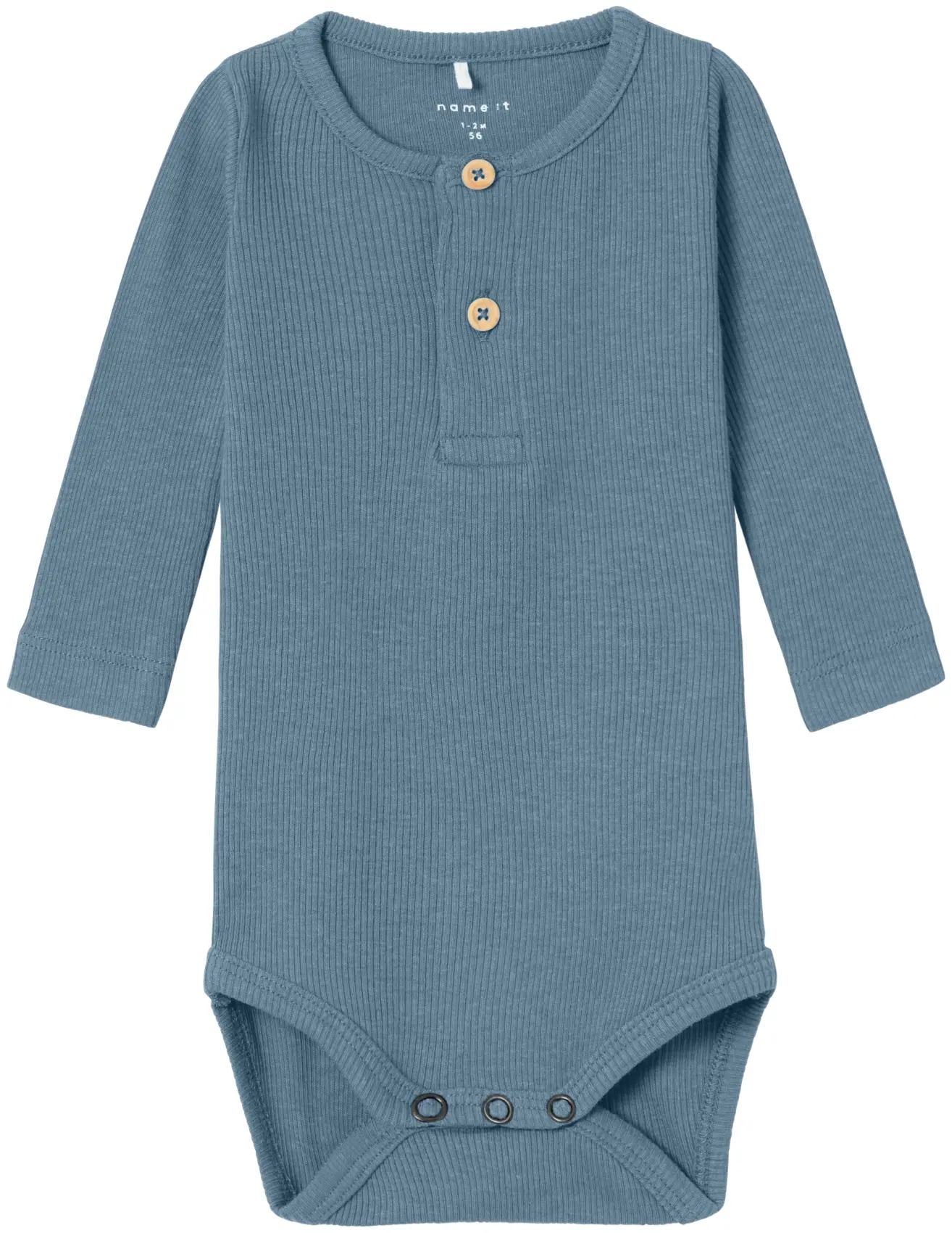 Name It bodyen er i en flot blå nuance og er lavet med rib og to knapper foran.