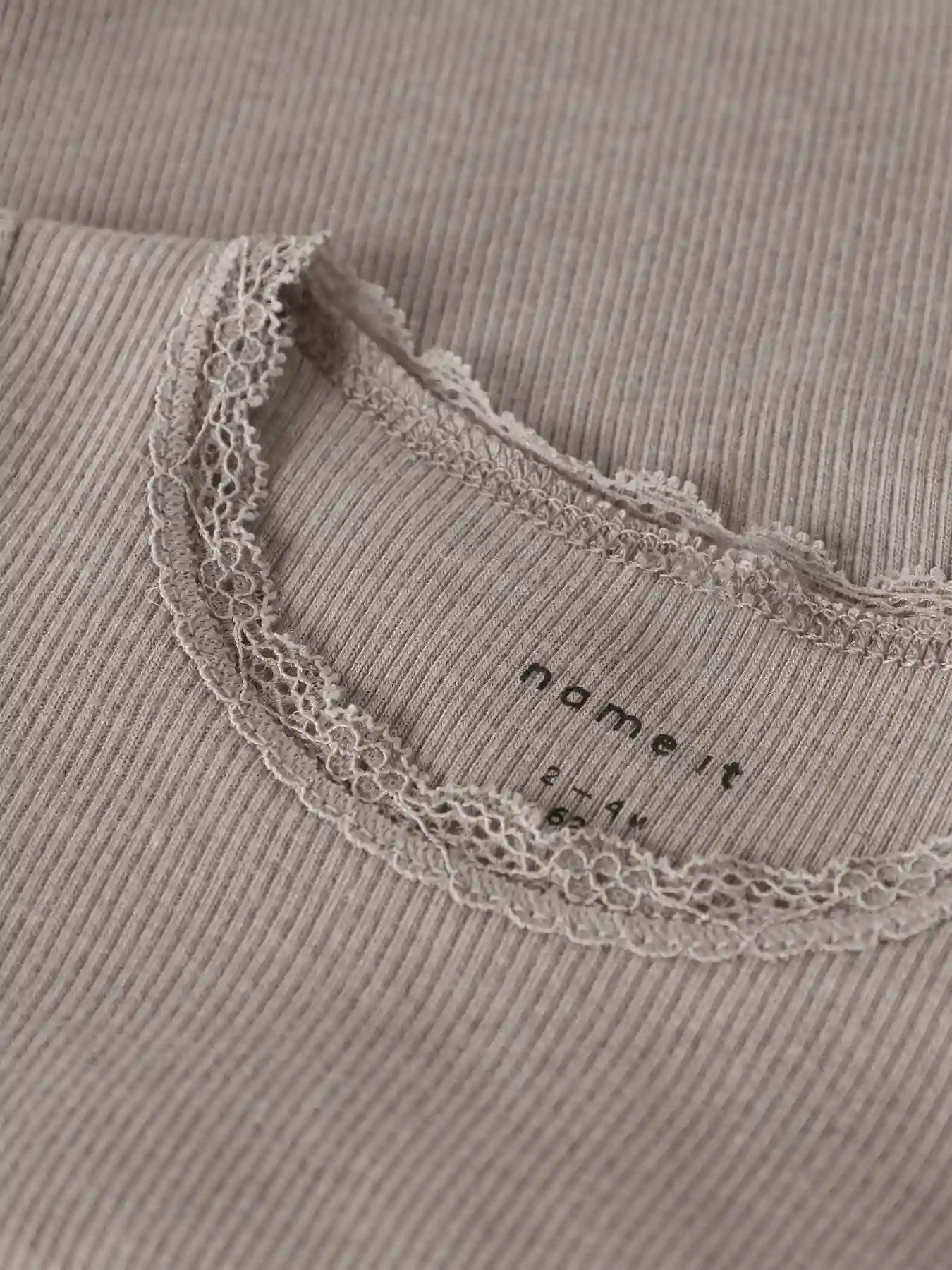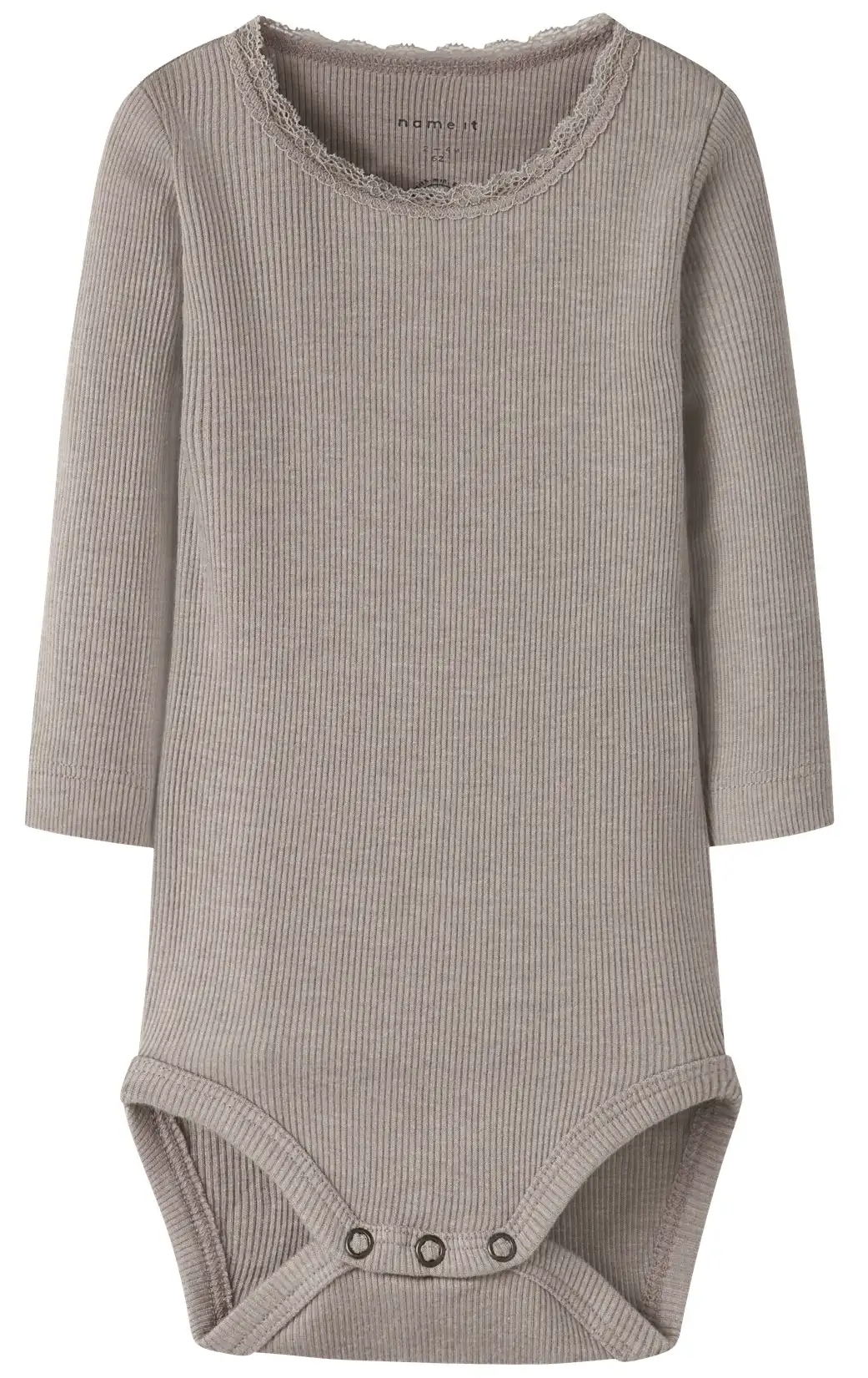 Name It bodyen er i en varm, meleret grå nuance med en fin lille blondekrave.