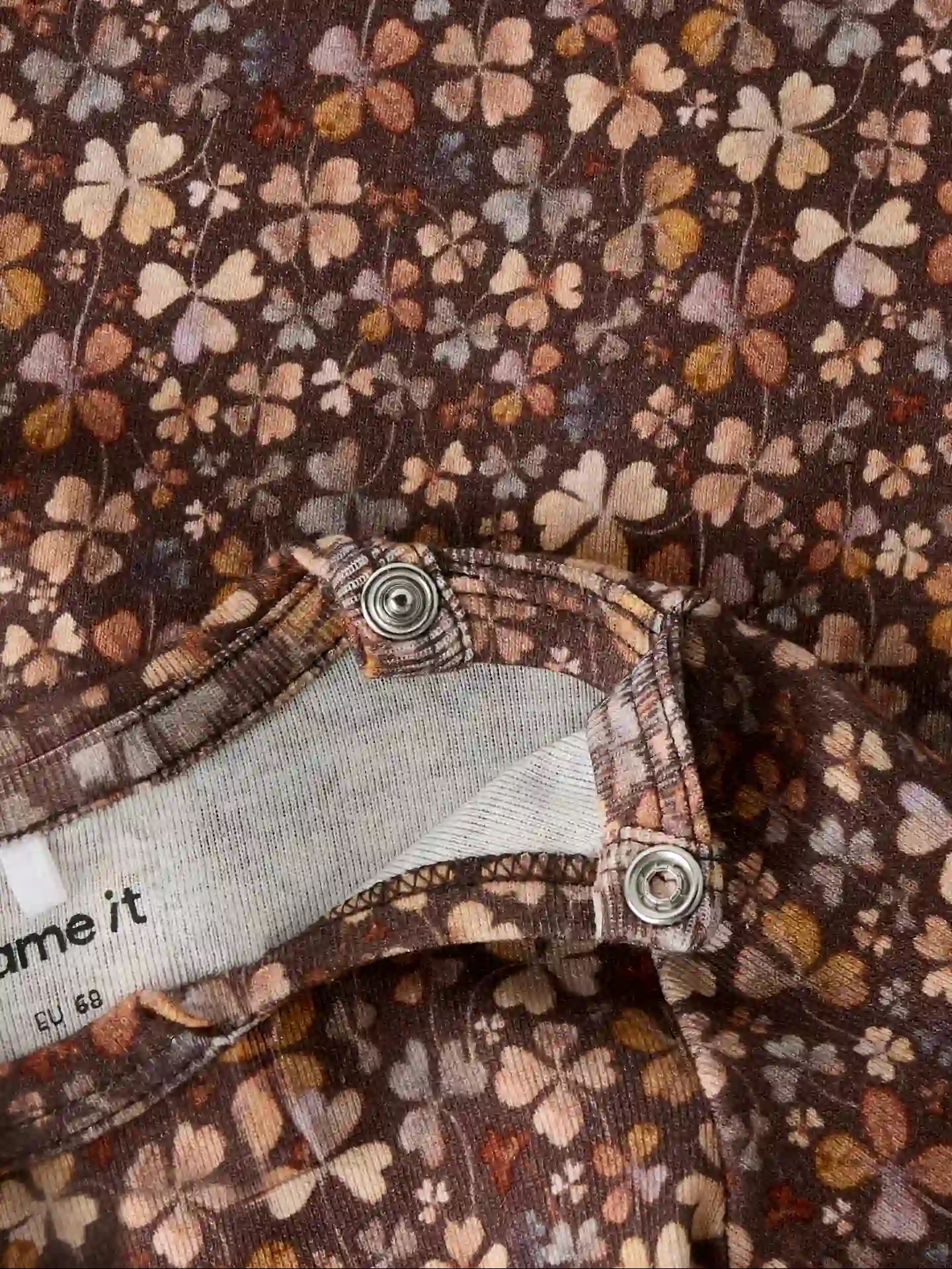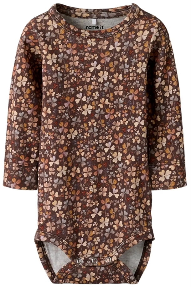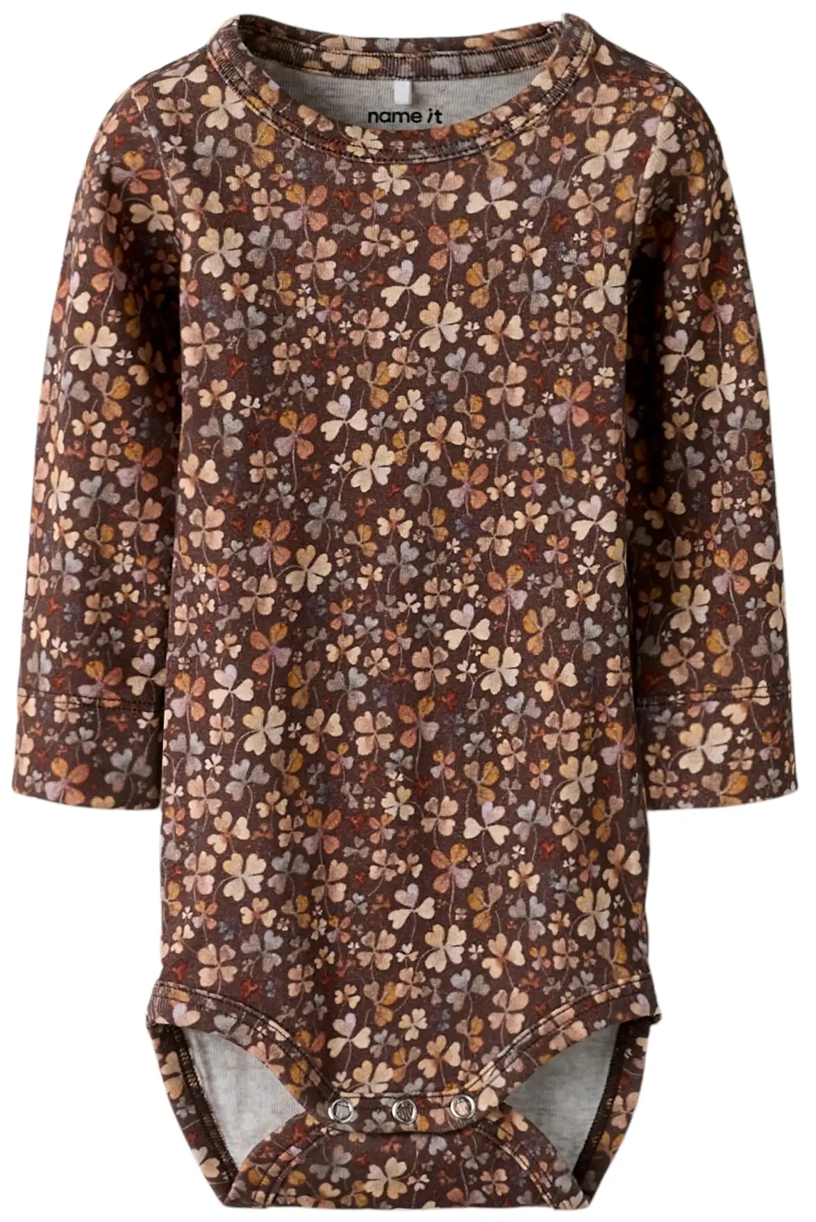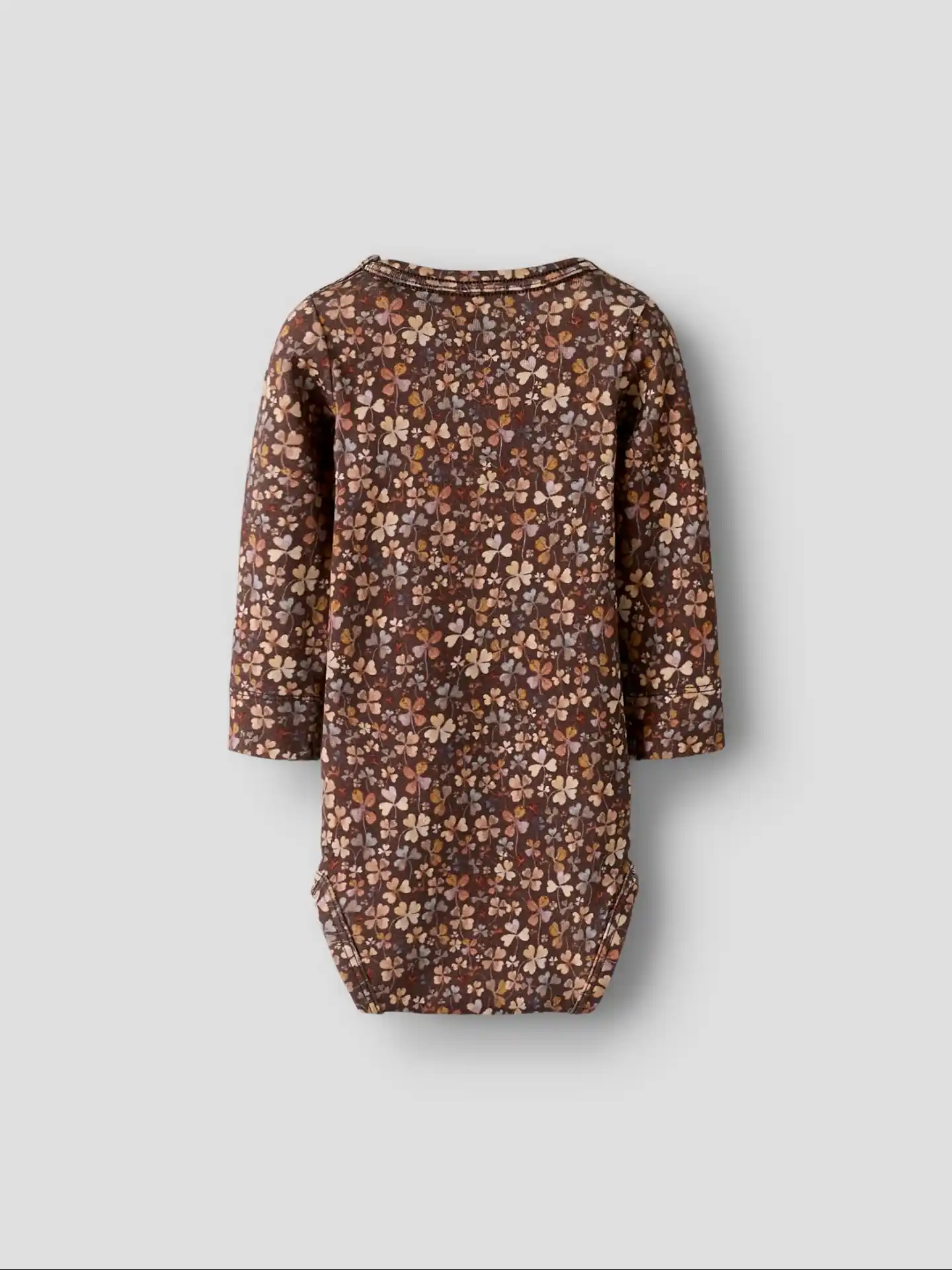 En dejlig blød Name It body i en varm, brun nuance med blomsterprint i skønne, gyldenbrune og lilla nuancer.