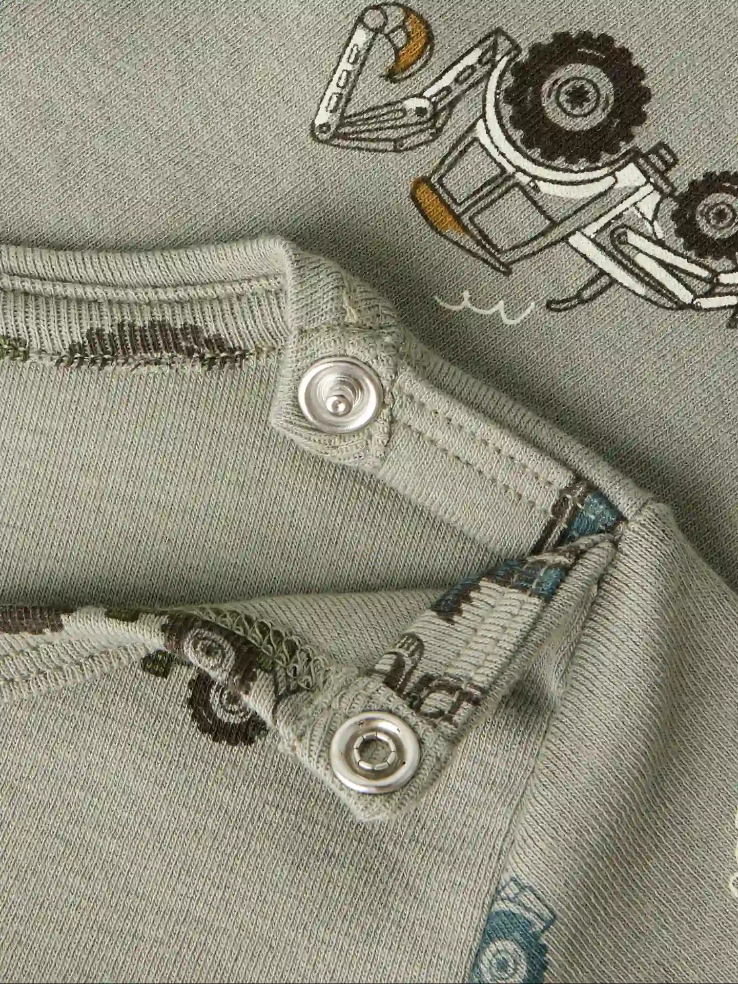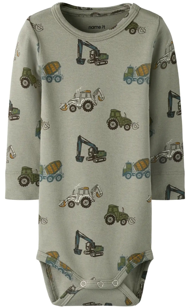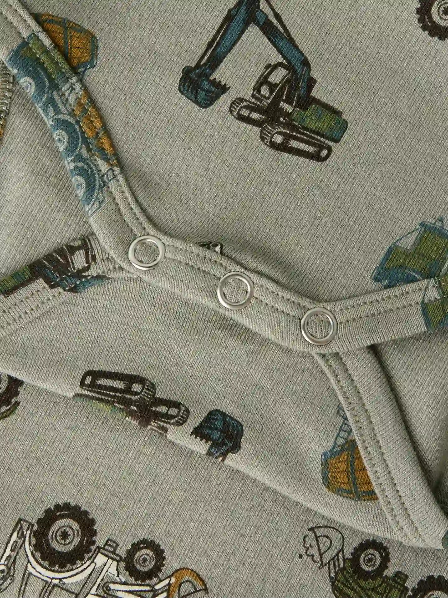 Bodyen er i støvet grøn med print af maskiner som traktorer og gravkøer.