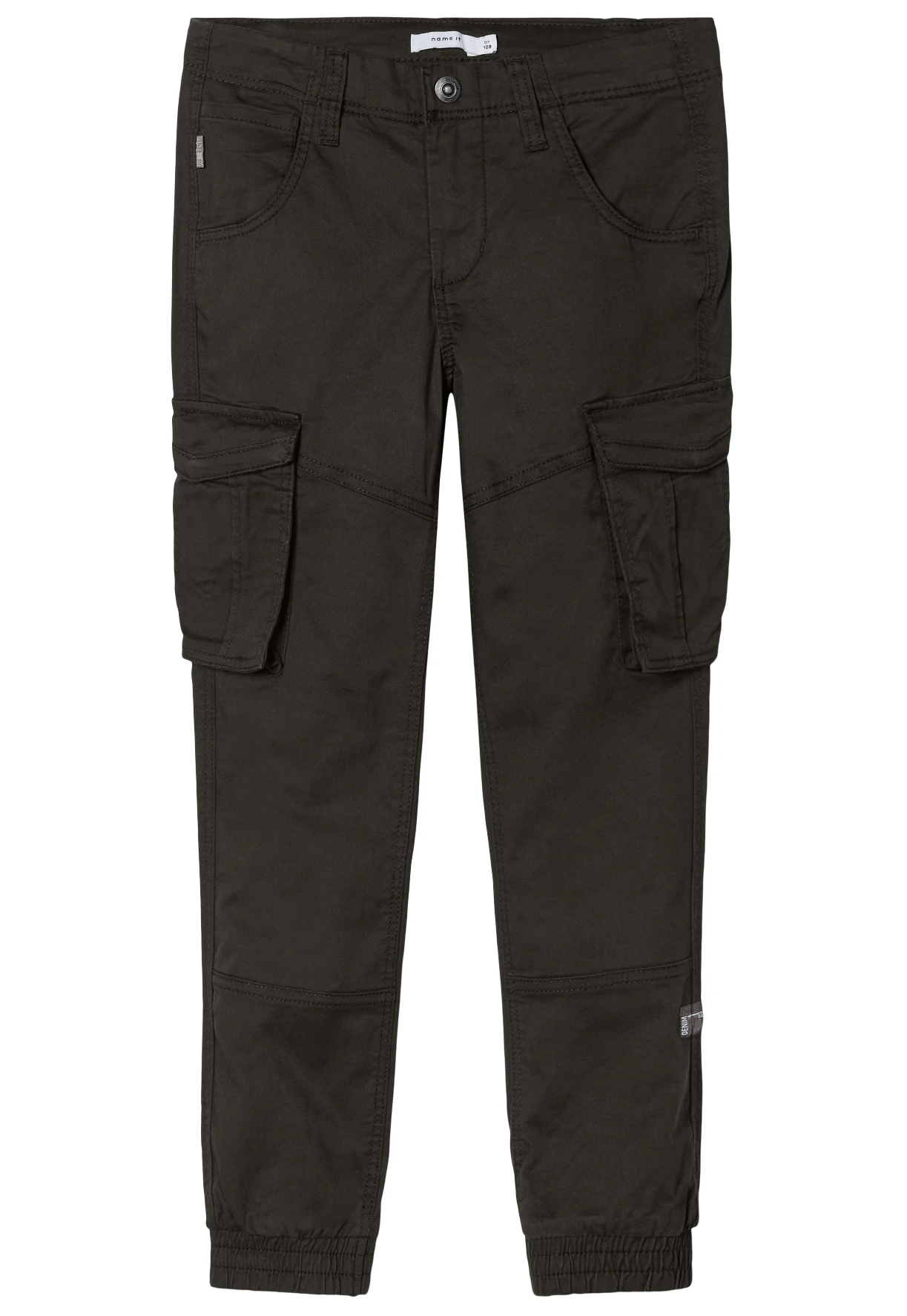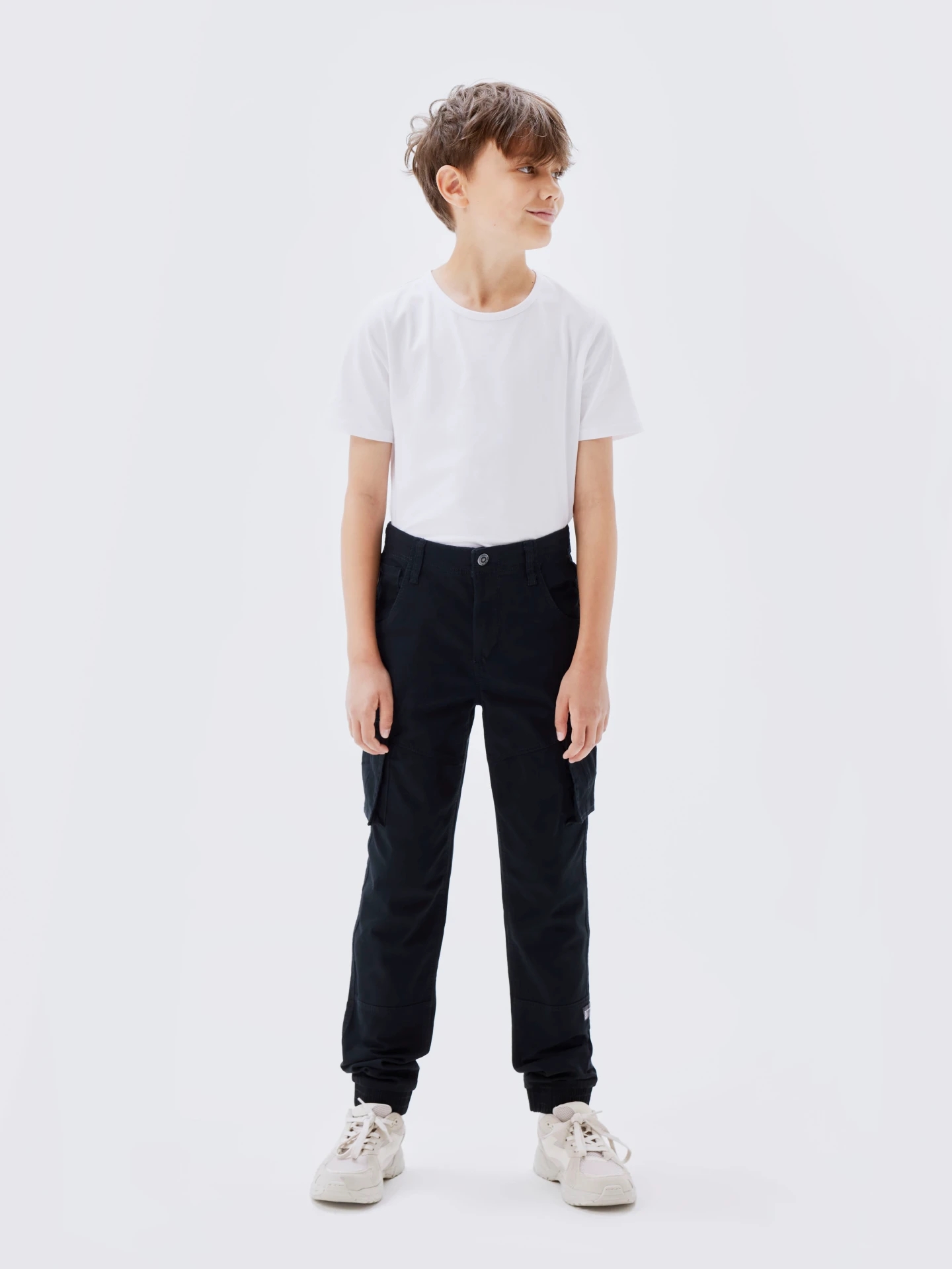 Fede Name It bukser i ensfarvet sort i den populære cargo model, som er perfekte til aktive børn, der både skal kunne bevæge sig frit og se smarte ud.