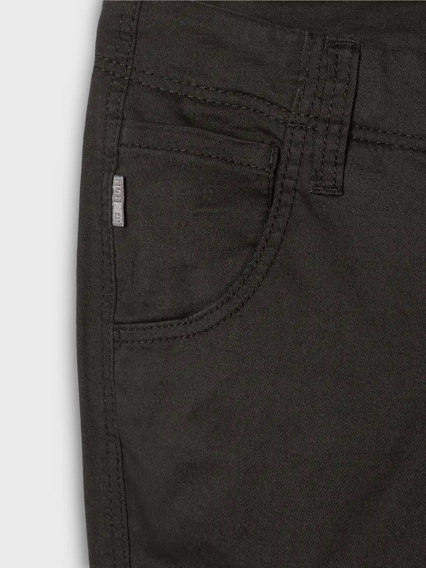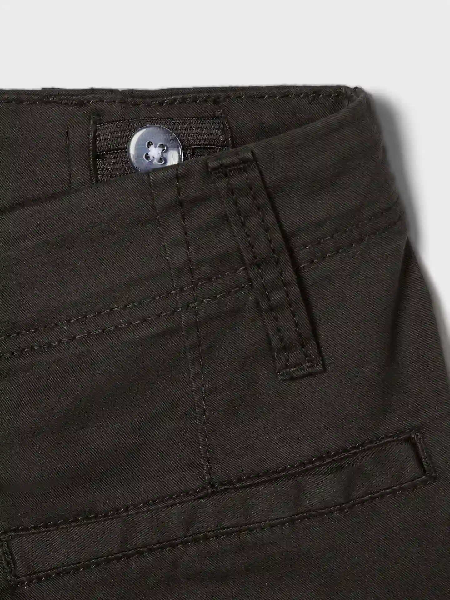 Name It Cargo bukserne har en blød, bred elastik i taljen og kan nemt justeres indvendigt med knapper. Bukserne lukkes med hægte og lynlås.