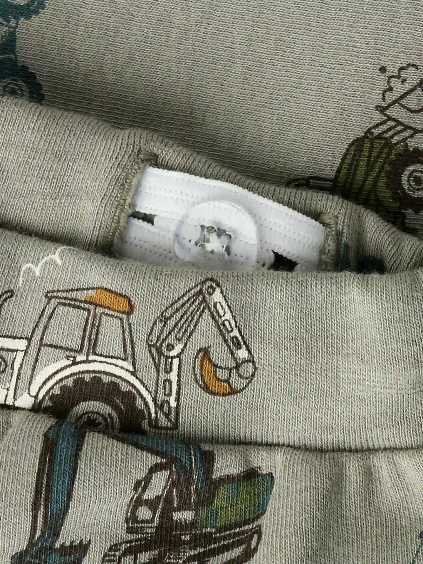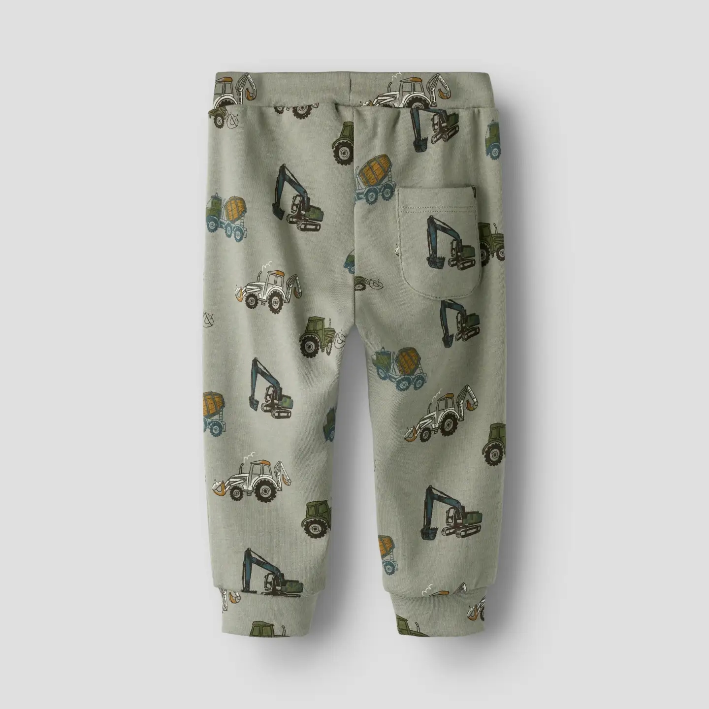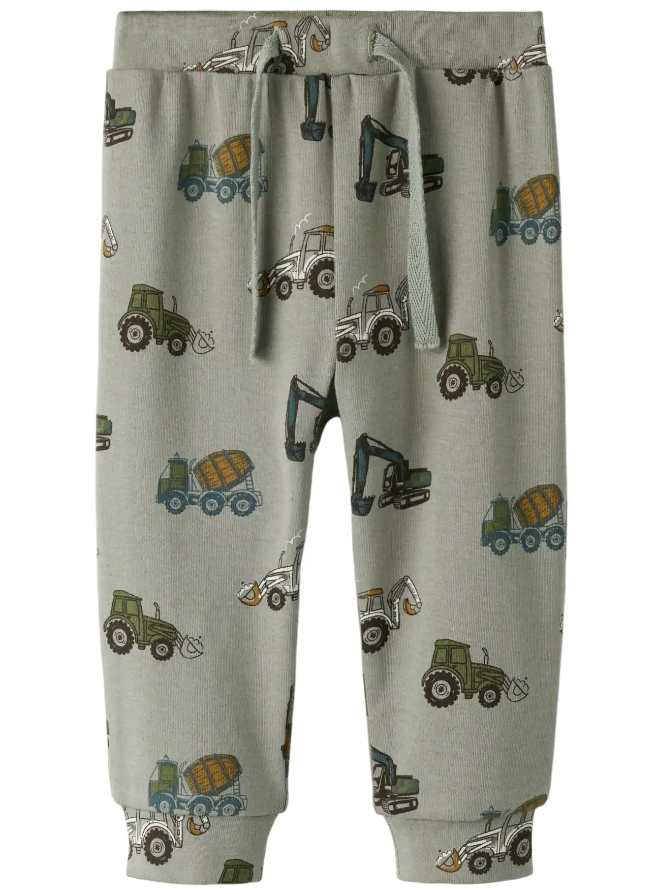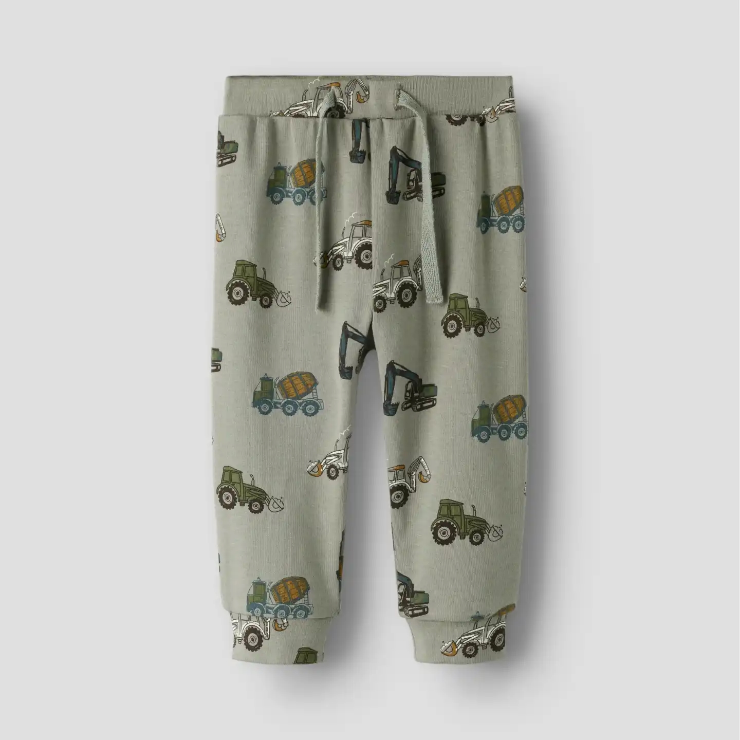 Name It bukserne er i støvet grøn med print af maskiner som traktorer og gravkøer.