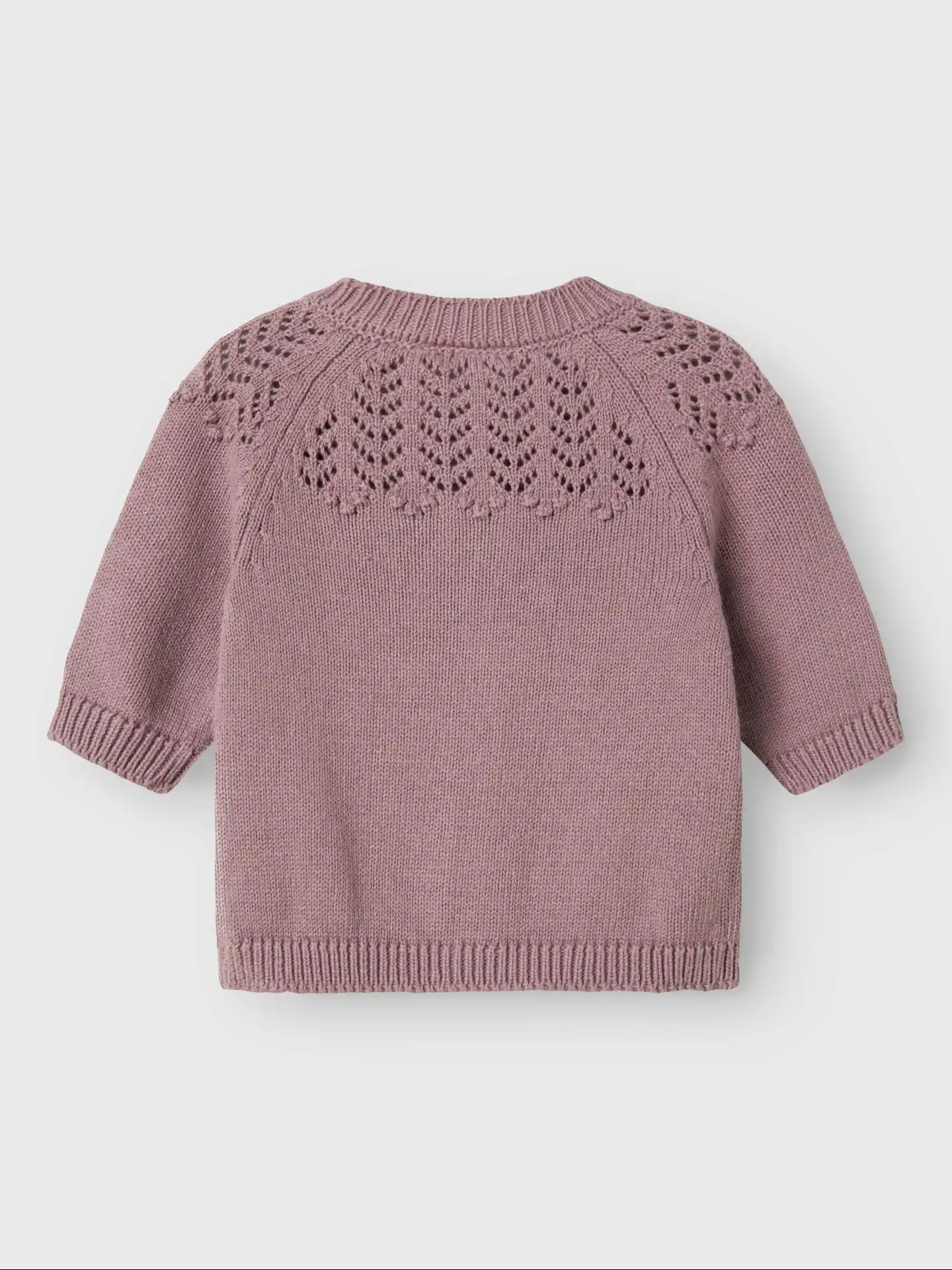 Name It cardiganen er i en flot, rødlilla nuance og er strikket i et flot mønster.