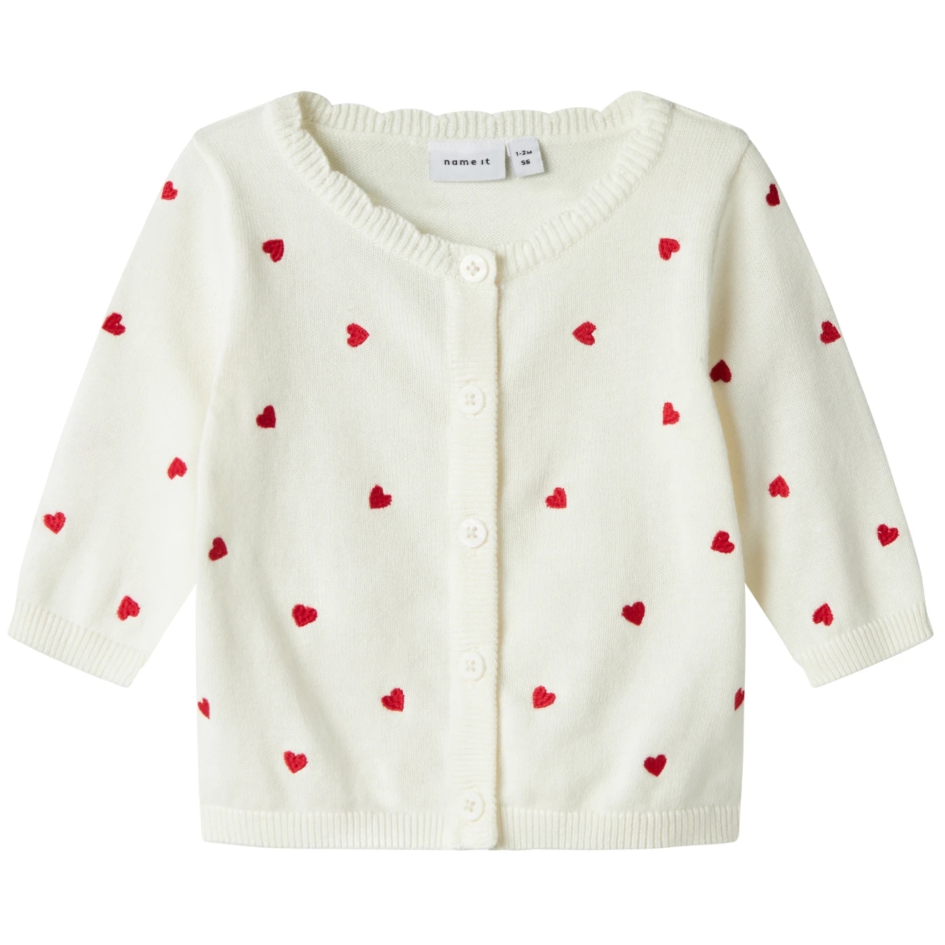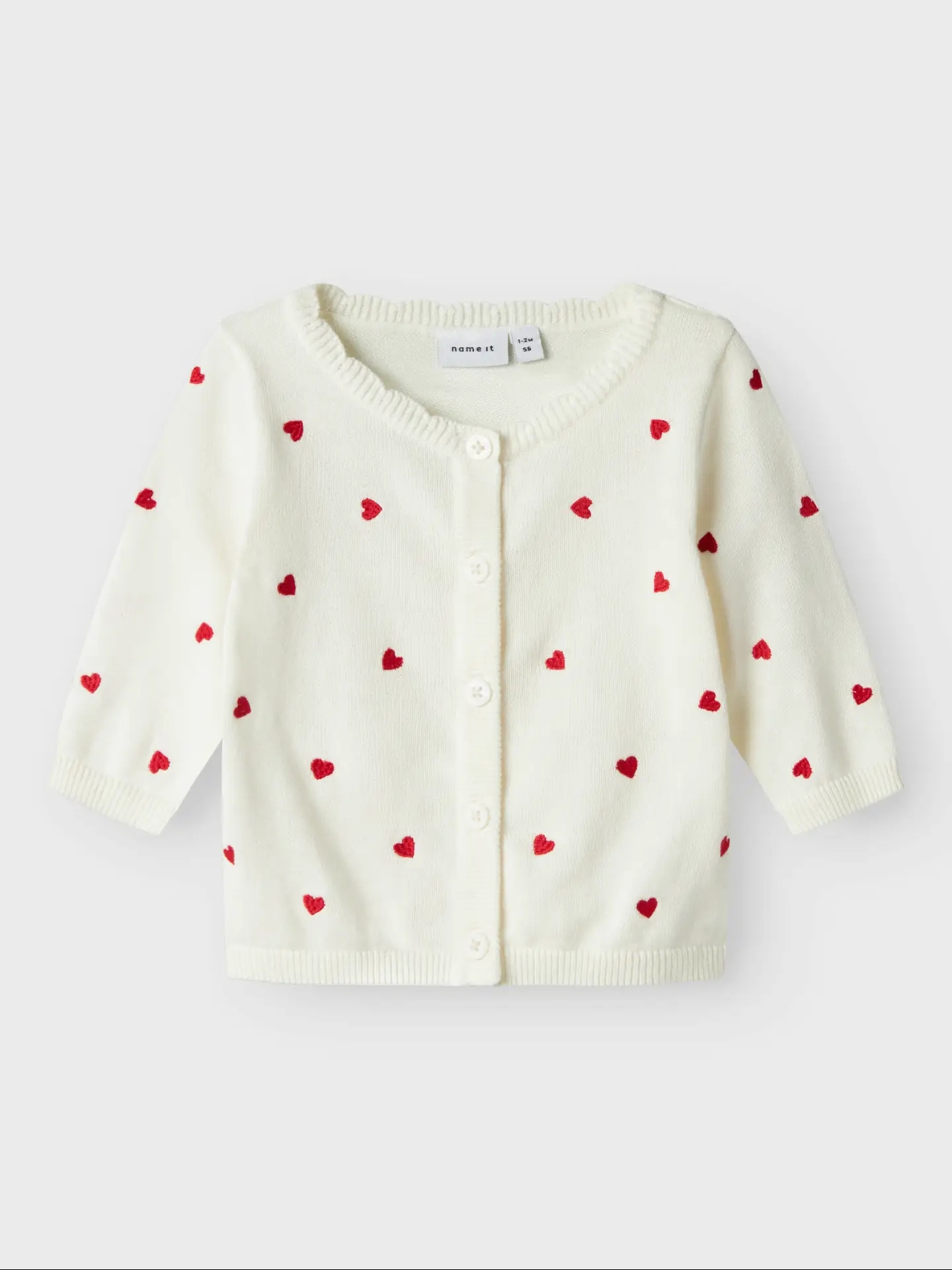 Name It cardiganen er hvid med broderede, røde hjerter foran og på ærmerne.