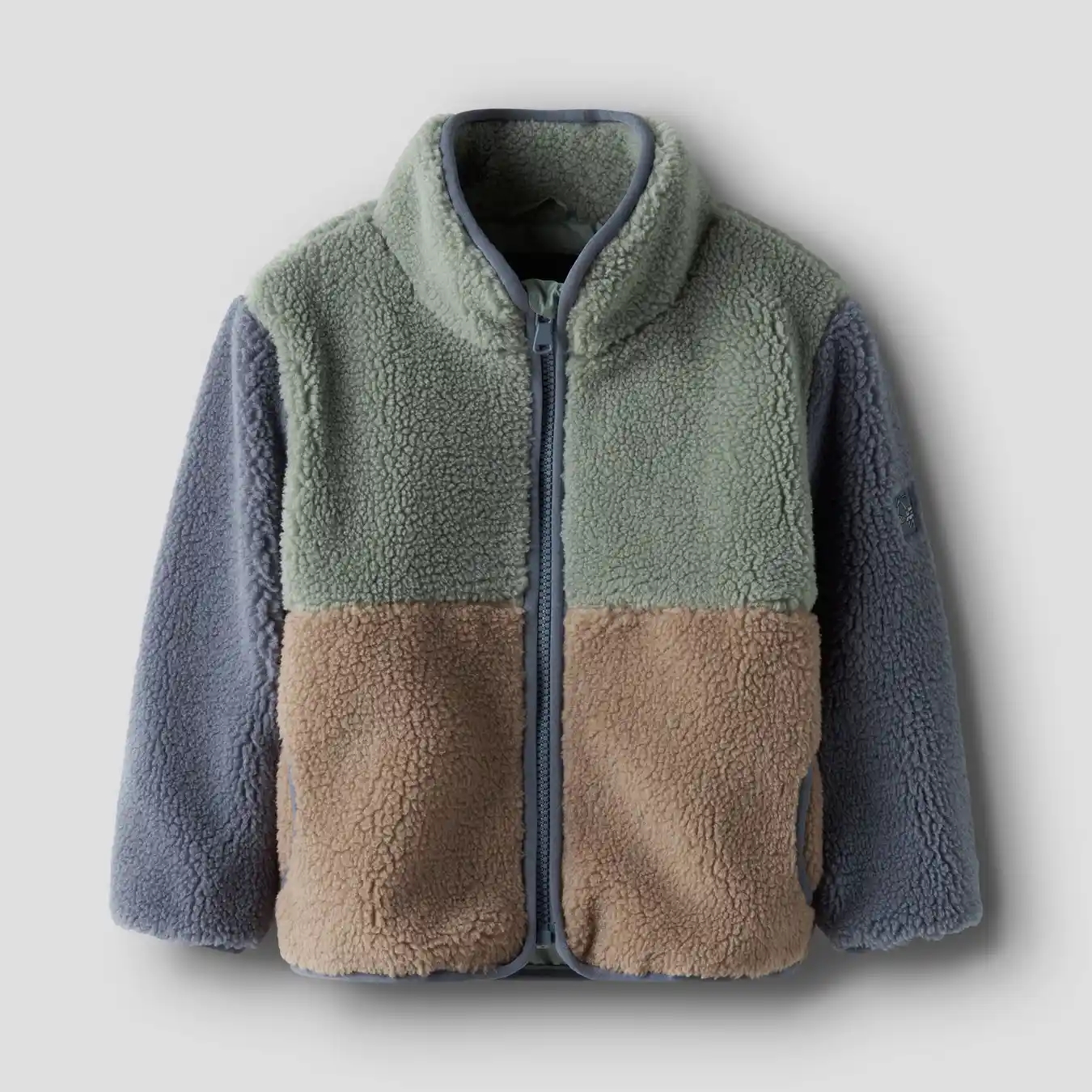 Name It fleecejakken er i støvet blå, grøn og brun og er super flot.