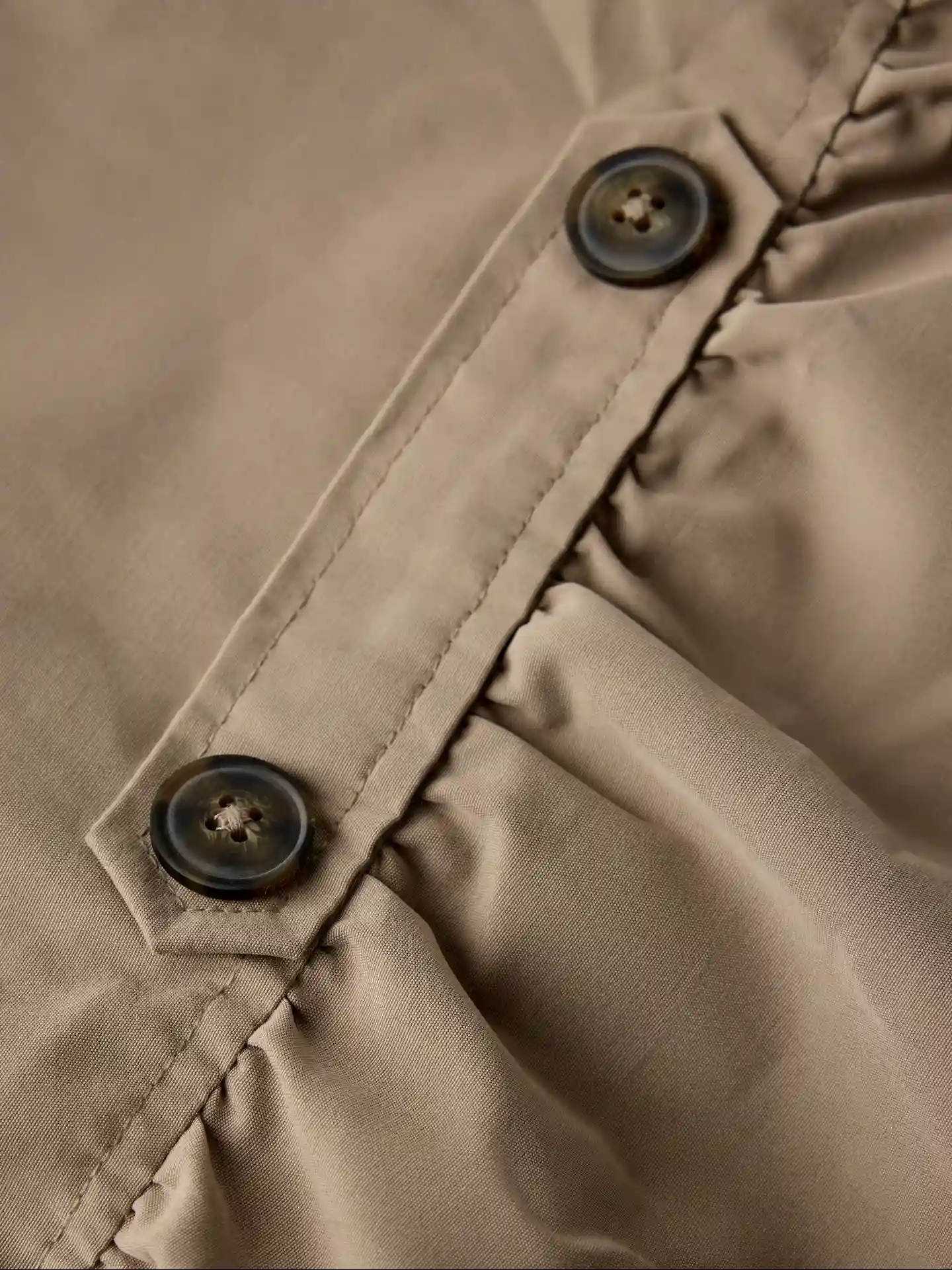 Jakken åbnes foran med knapper og har en lomme i hver side foran. Den har ligeledes knap-detaljer både bagpå og på ærmerne.