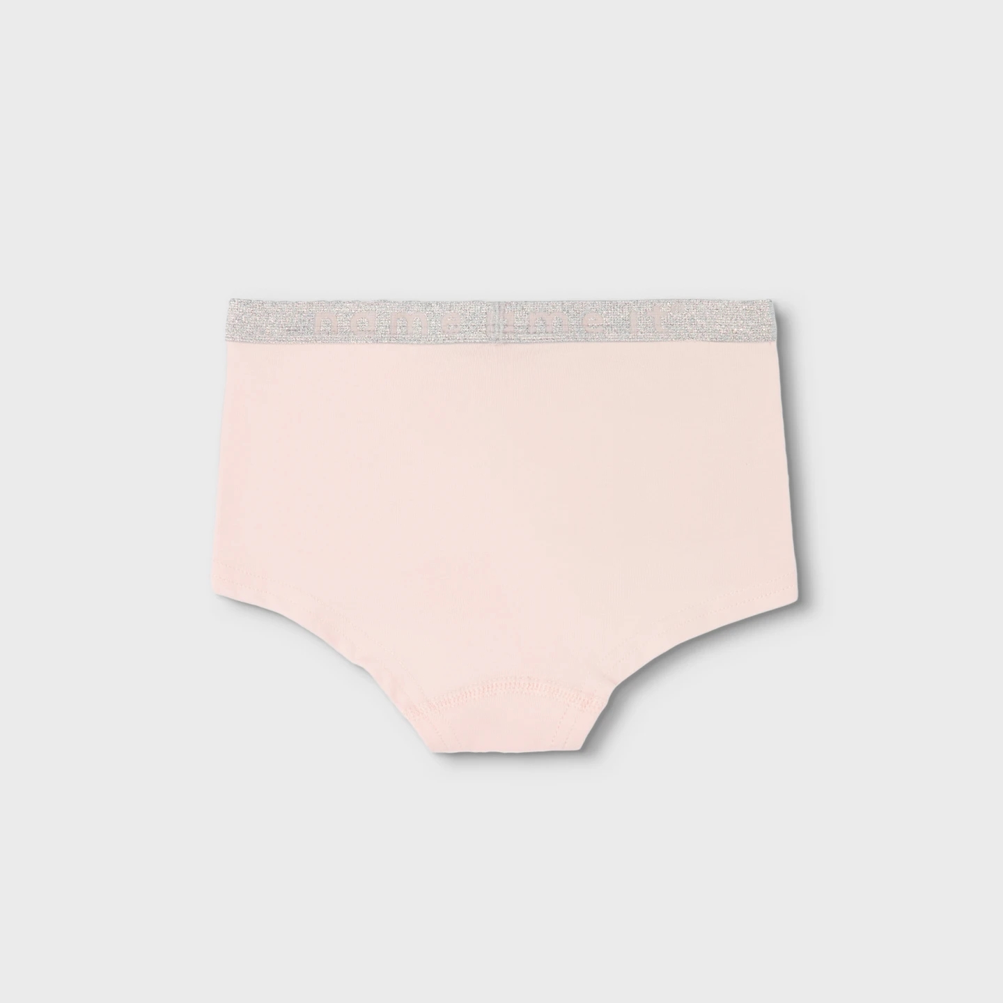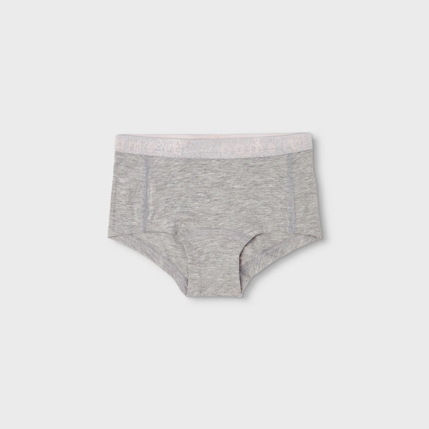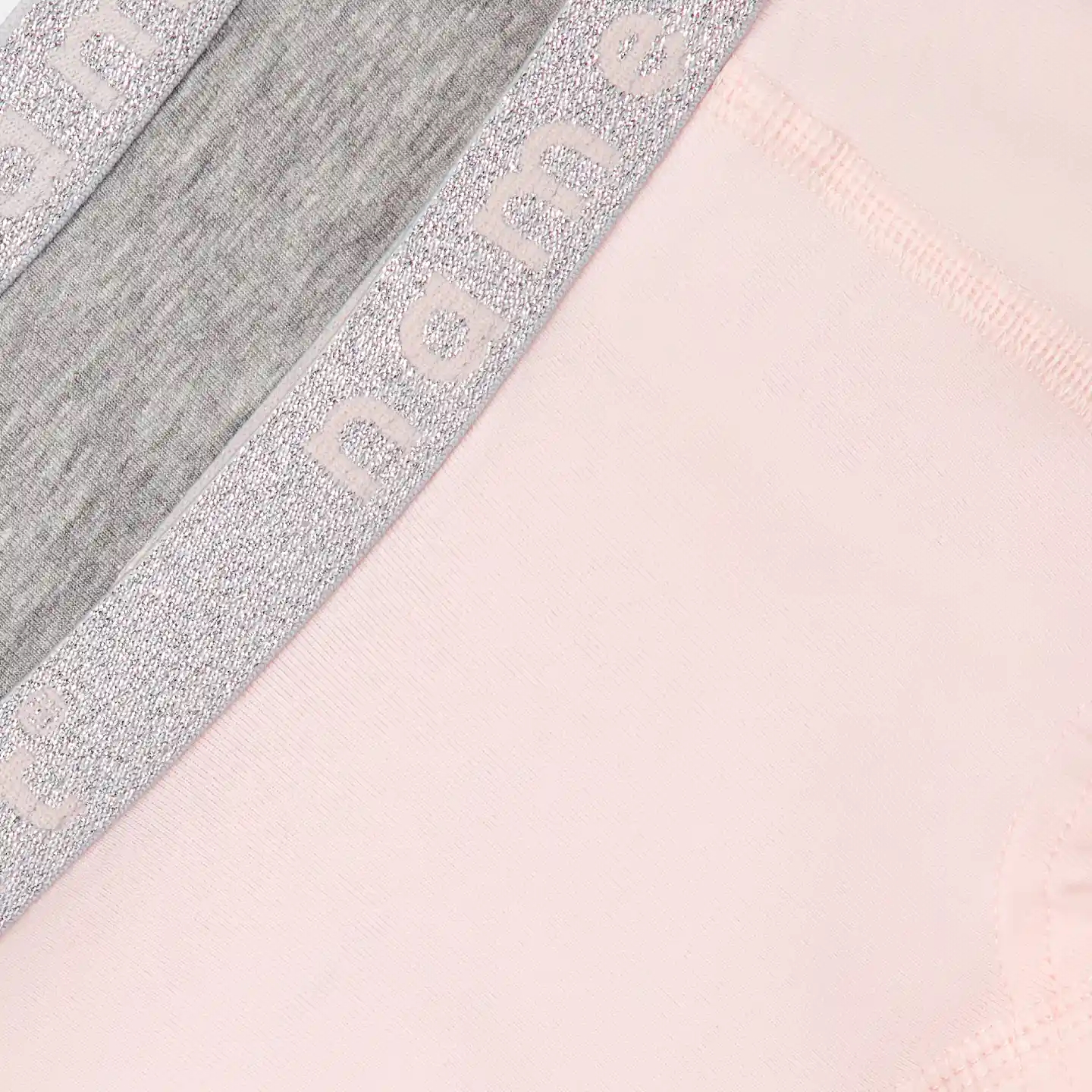 Name It hipster i denne praktiske 2-pak er behageligt og blødt basistøj til piger. Pakken består af to par hipsters: et par i en fin rosa farve og et par i meleret grå. Begge par har en god elastikkant med diskret glimmer, som er en sød detalje, der gør dem lidt sjovere at have på i hverdagen.