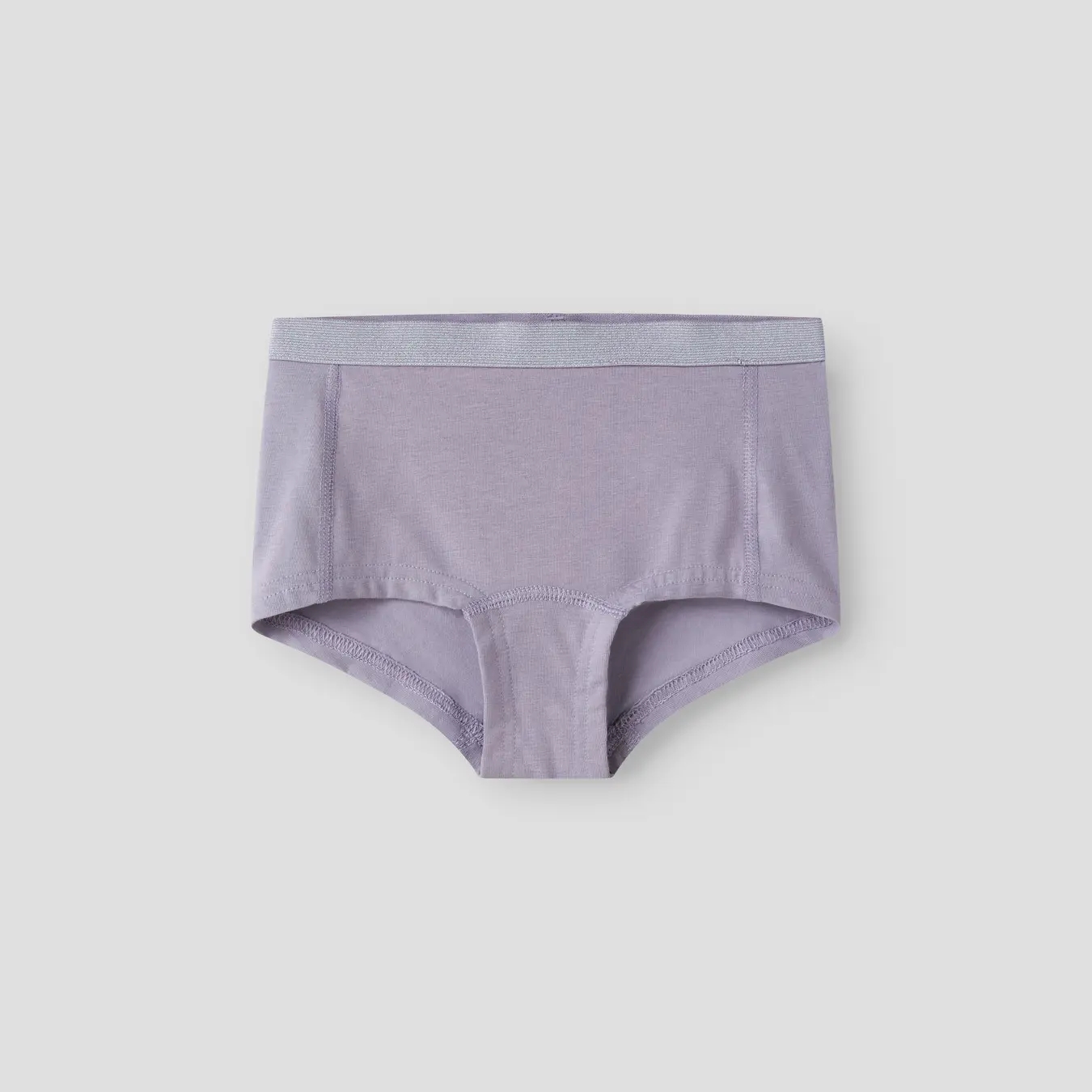Pakken indeholder en Name It hipster i ensfarvet rosa, ensfarvet lilla og en i lilla med røde hjerter. De er med elastik i taljen, som på ydersiden er med glimmer.