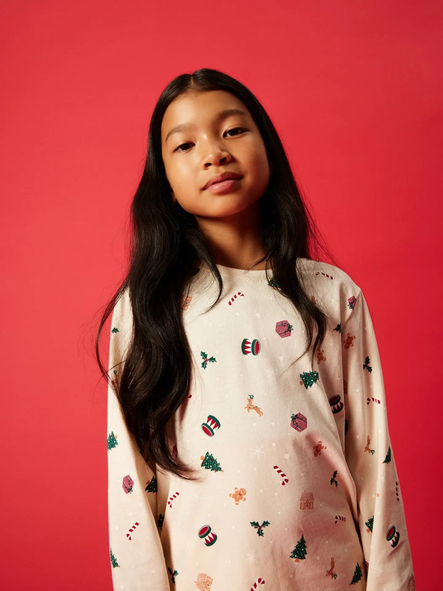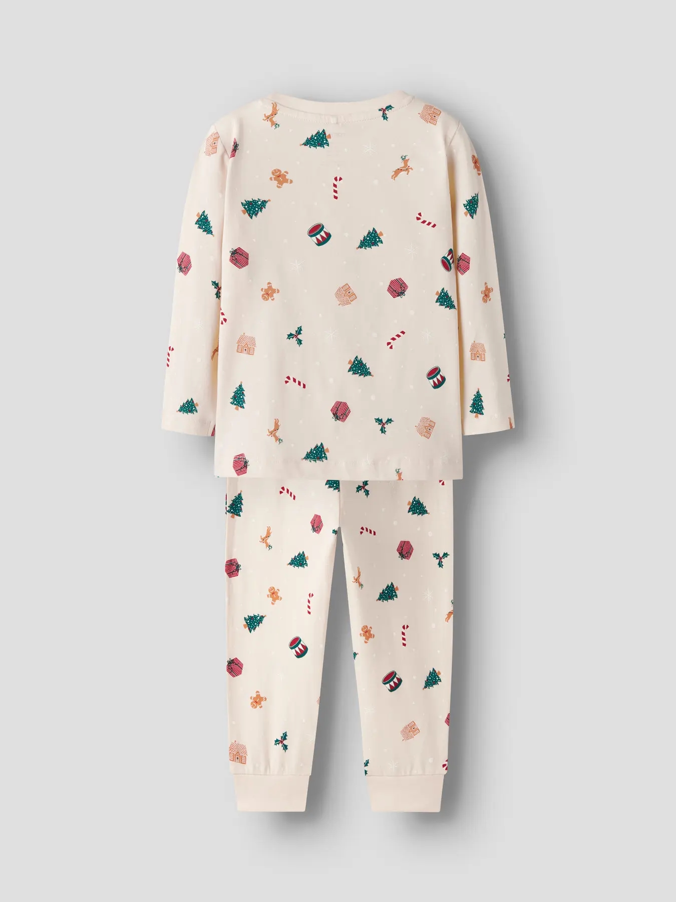 Name It julenattøjet er i en flot lys farve med et rigtig fint juleprint med bl.a. kagemænd, rensdyr, juletræer, slikstokke, gaver og snefnug. Nattøjet er todelt og består af bluse og bukser og er dejlig blødt.