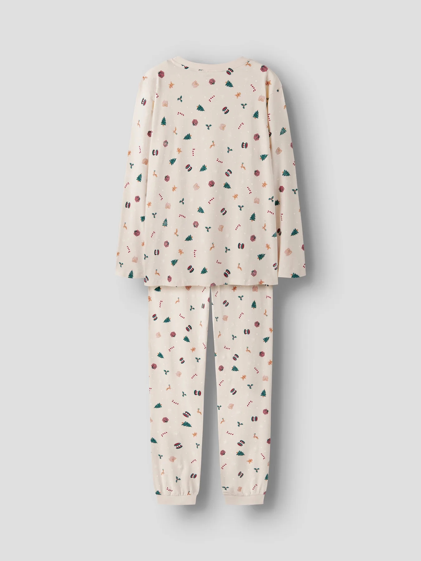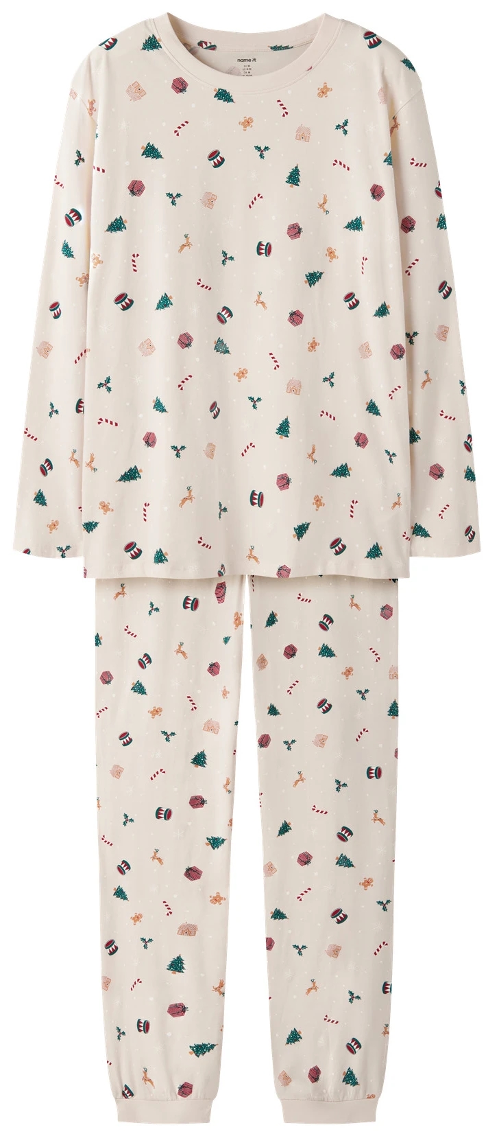 Name It julenattøjet er i en flot lys farve med et rigtig fint juleprint med bl.a. kagemænd, rensdyr, juletræer, slikstokke, gaver og snefnug. Nattøjet er todelt og består af bluse og bukser og er dejlig blødt.
