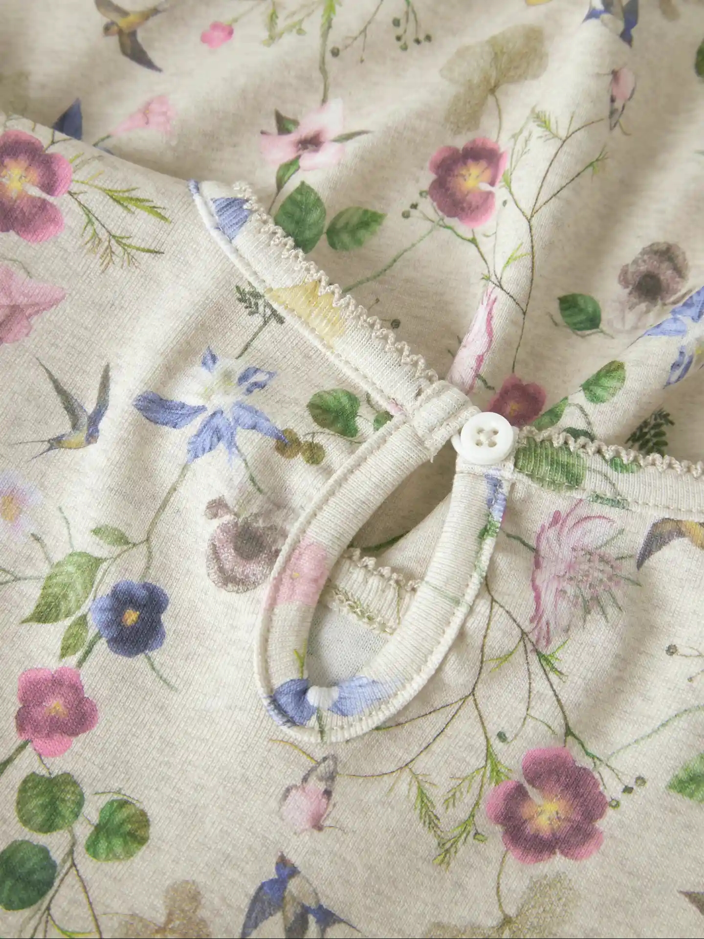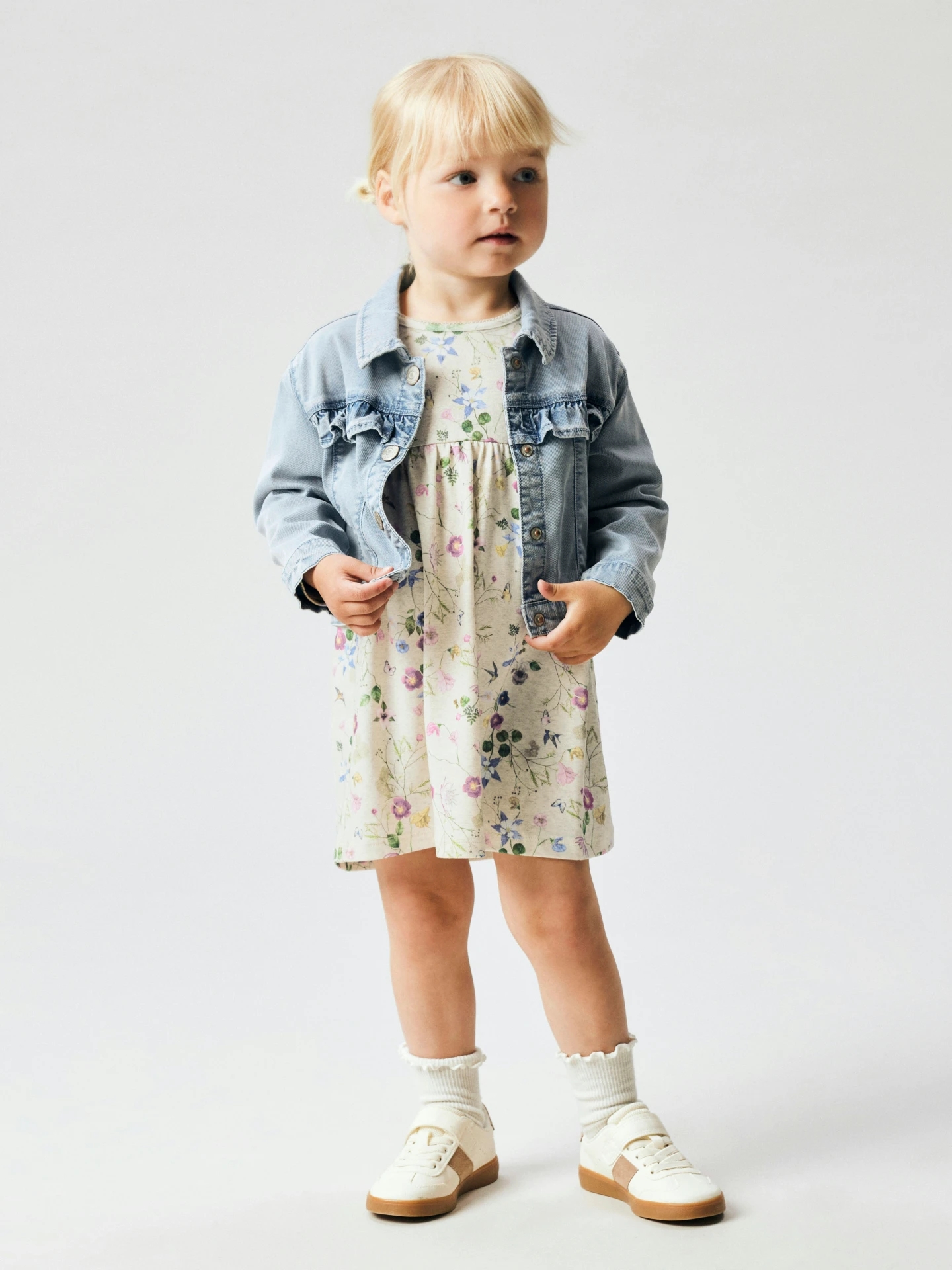 Name It kjolen er med lange ærmer og flæser på skuldrene. Den er lavet i en blanding af økologisk bomuld, modal og elastan, som gør den dejlig blød og strækbar.