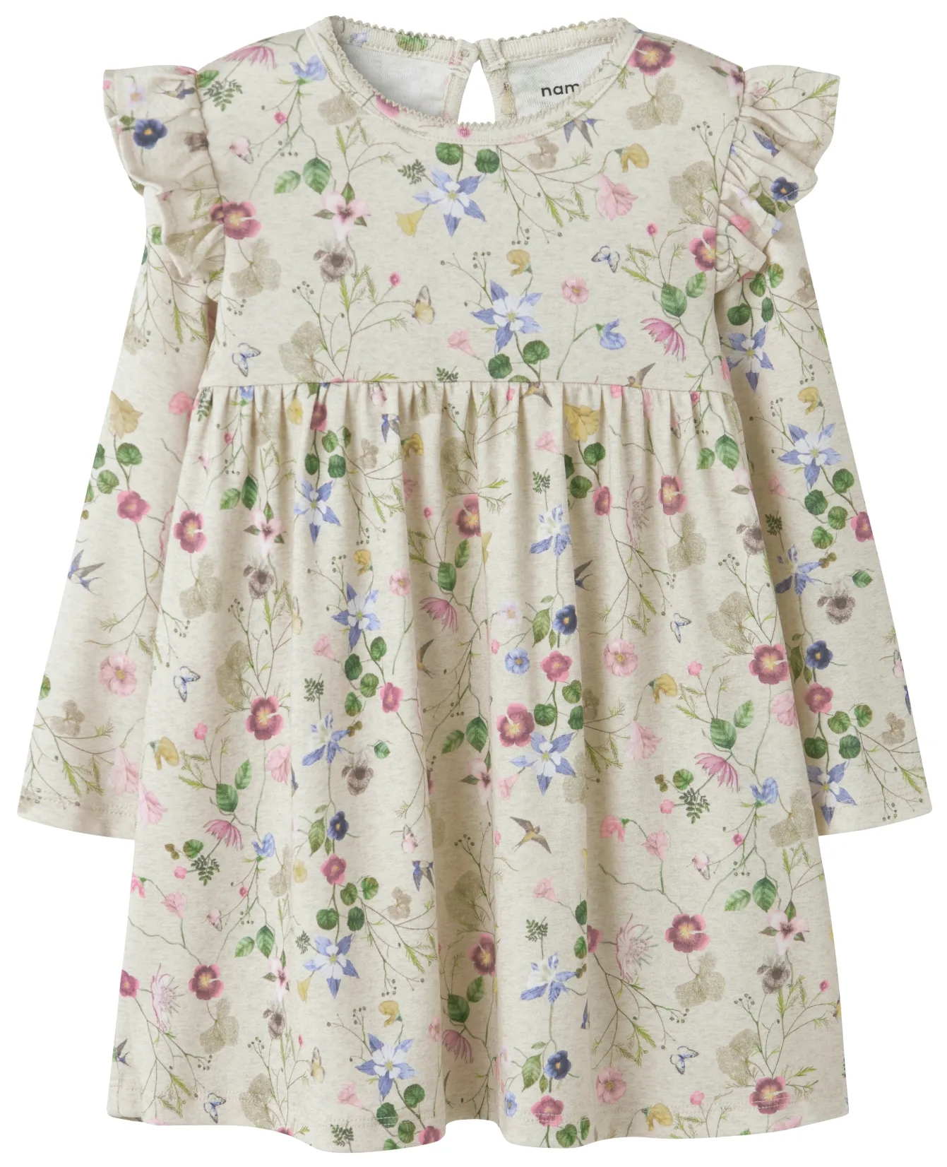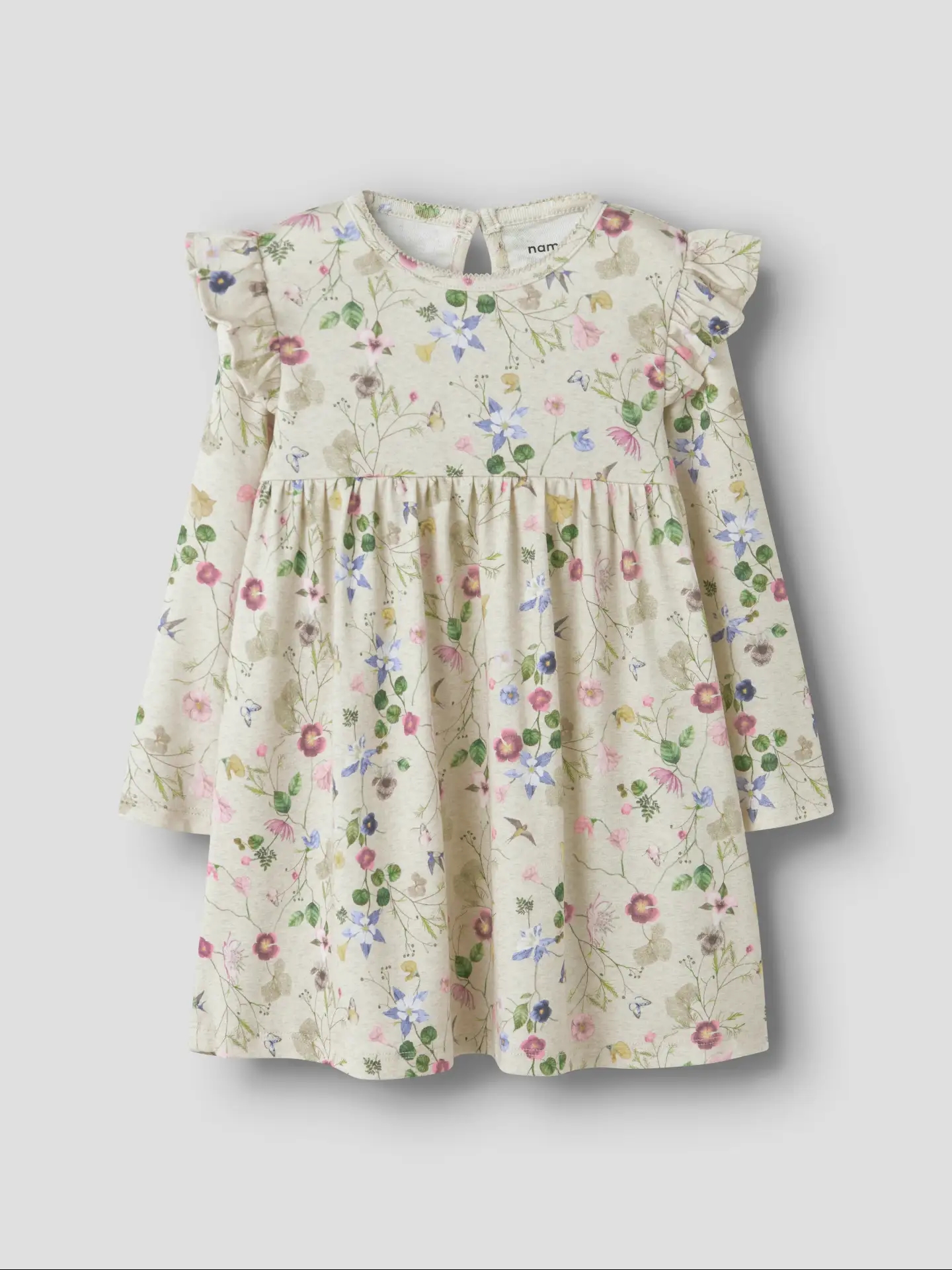 En sød Name It kjole med et fint print af blomster, blade og sommerfugle i rosa, lilla, grønne og gule farver.