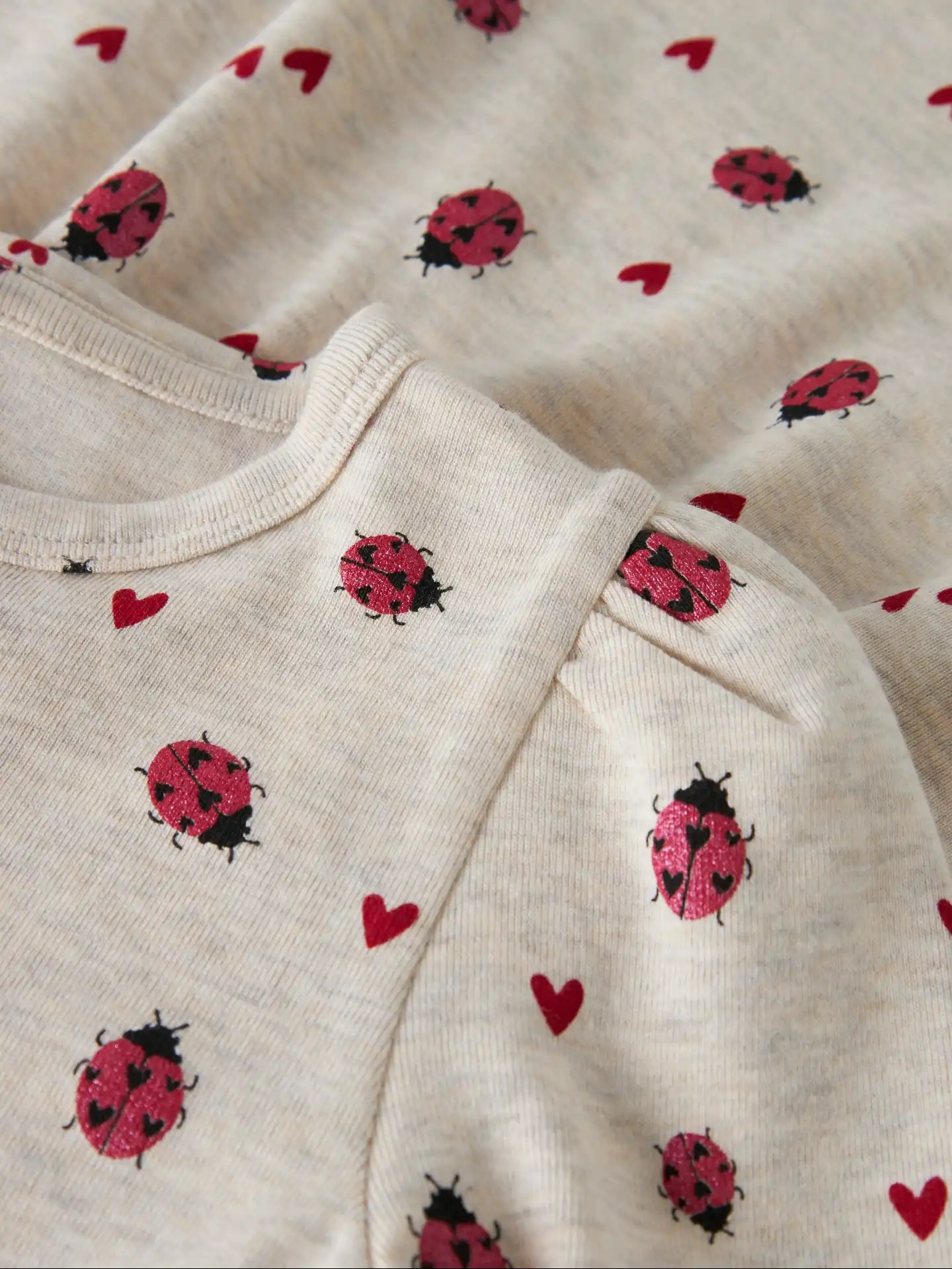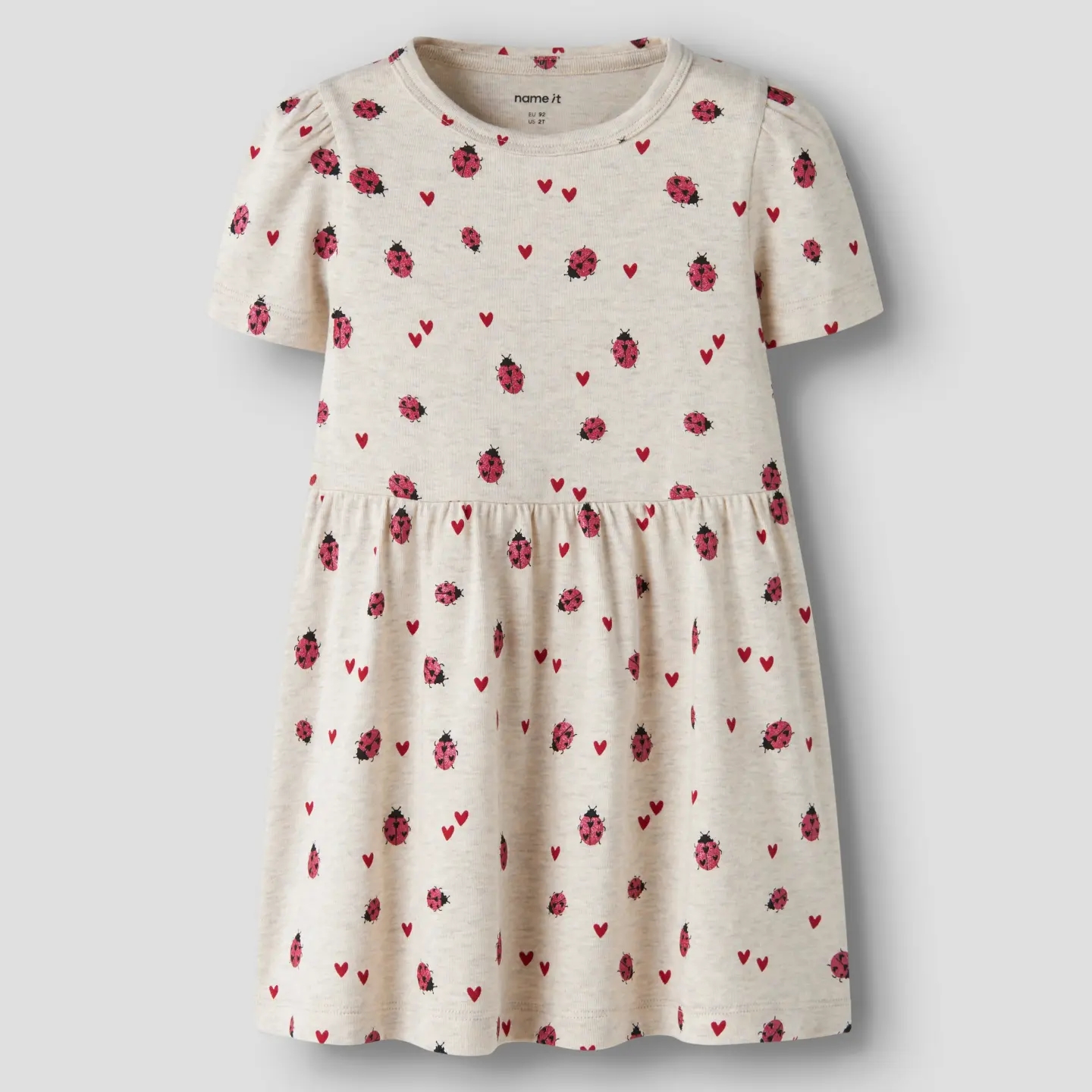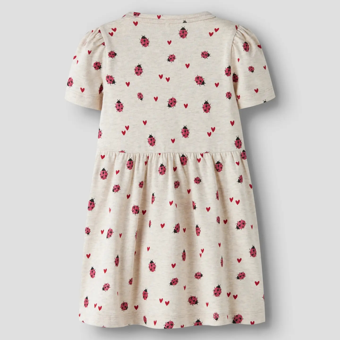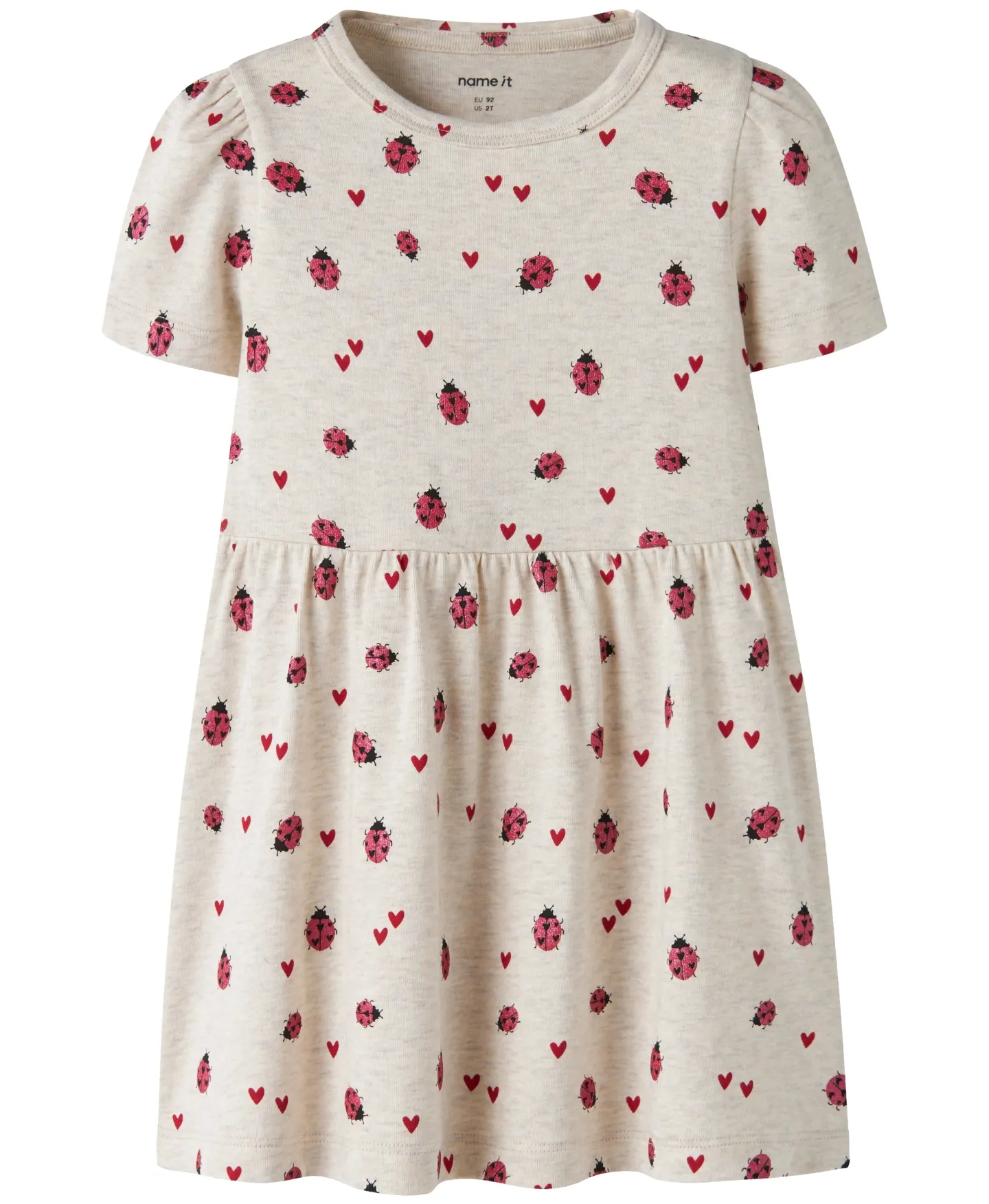 Name It kjolen er kortærmet og er lavet i meleret beige med print af mariehøner med glimmer, samt røde hjerter, som gør den så yndig.