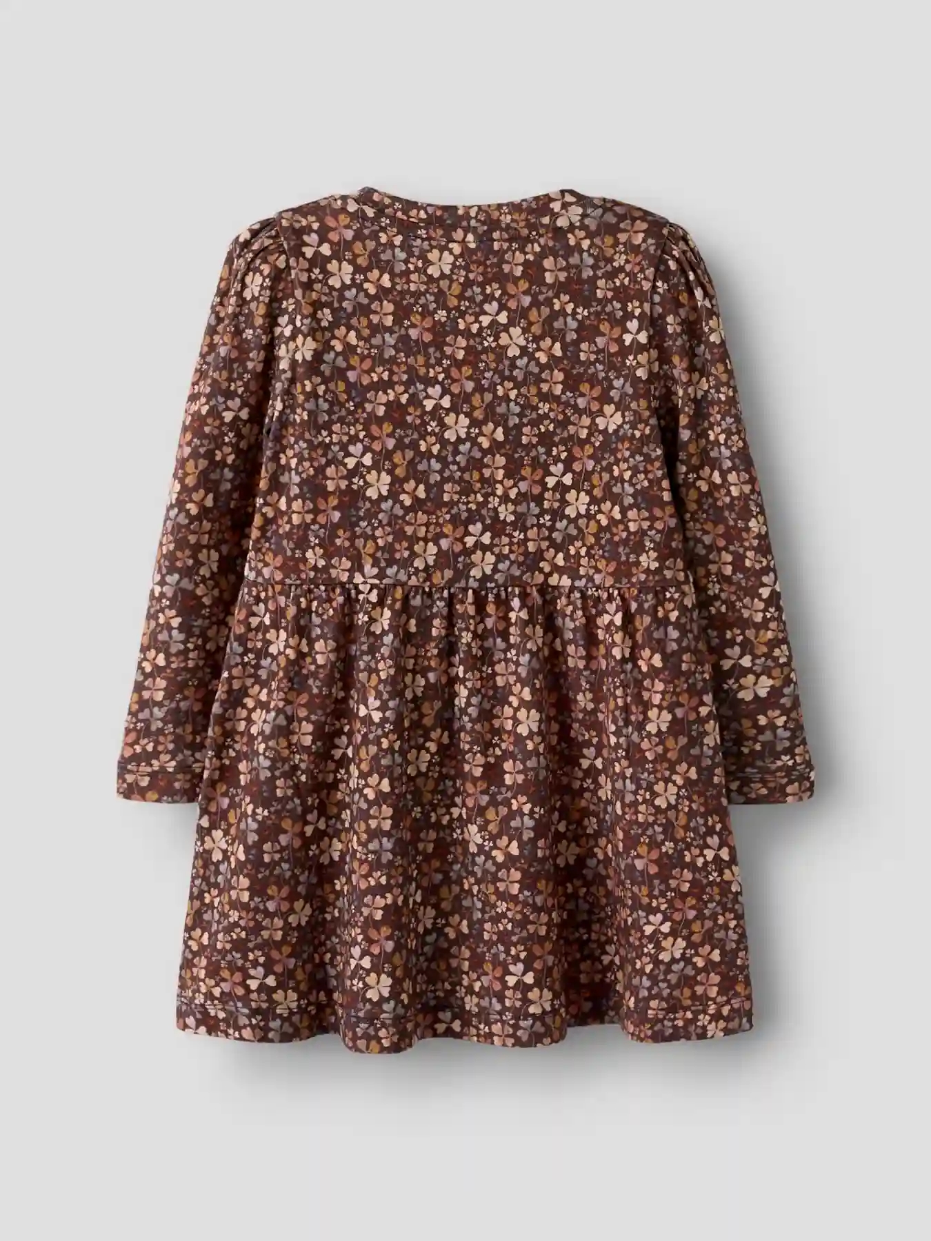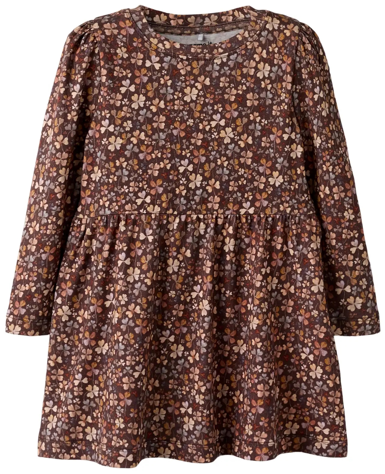 Name It kjolen i en varm, brun nuance med blomsterprint i skønne, gyldenbrune og lilla nuancer.