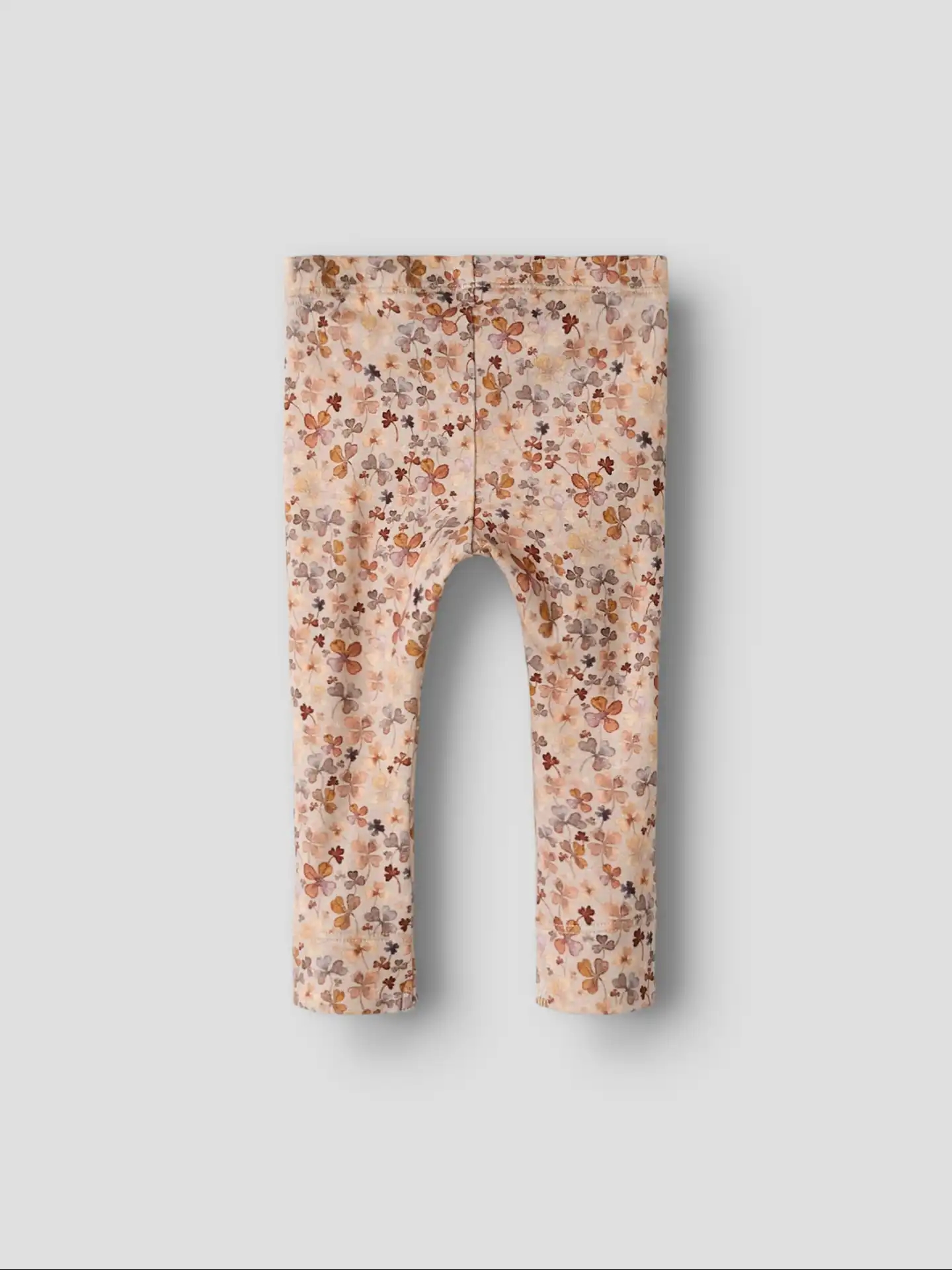 Name It leggingsene er i en varm, lys farve med blomsterprint i skønne, gyldenbrune og lilla nuancer.