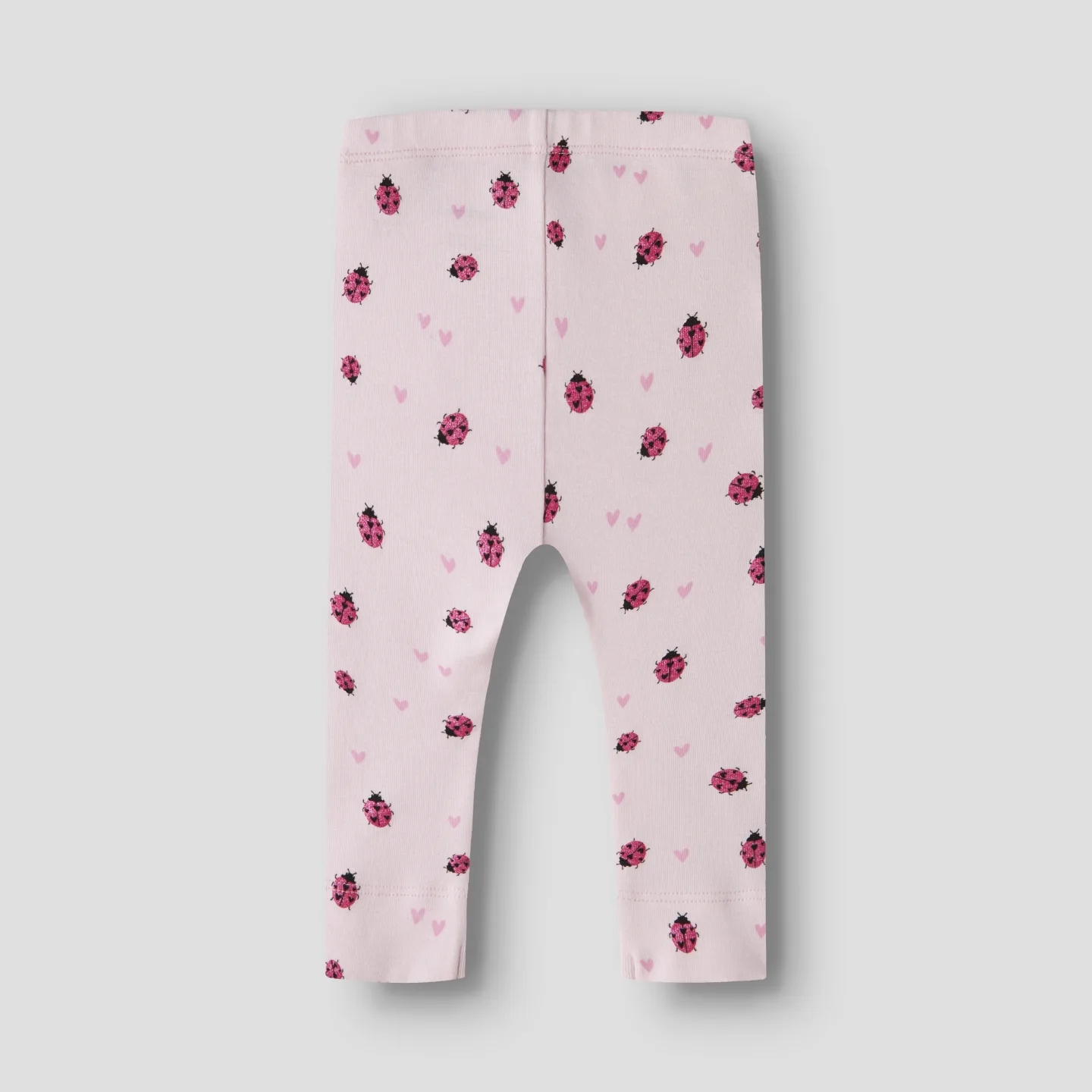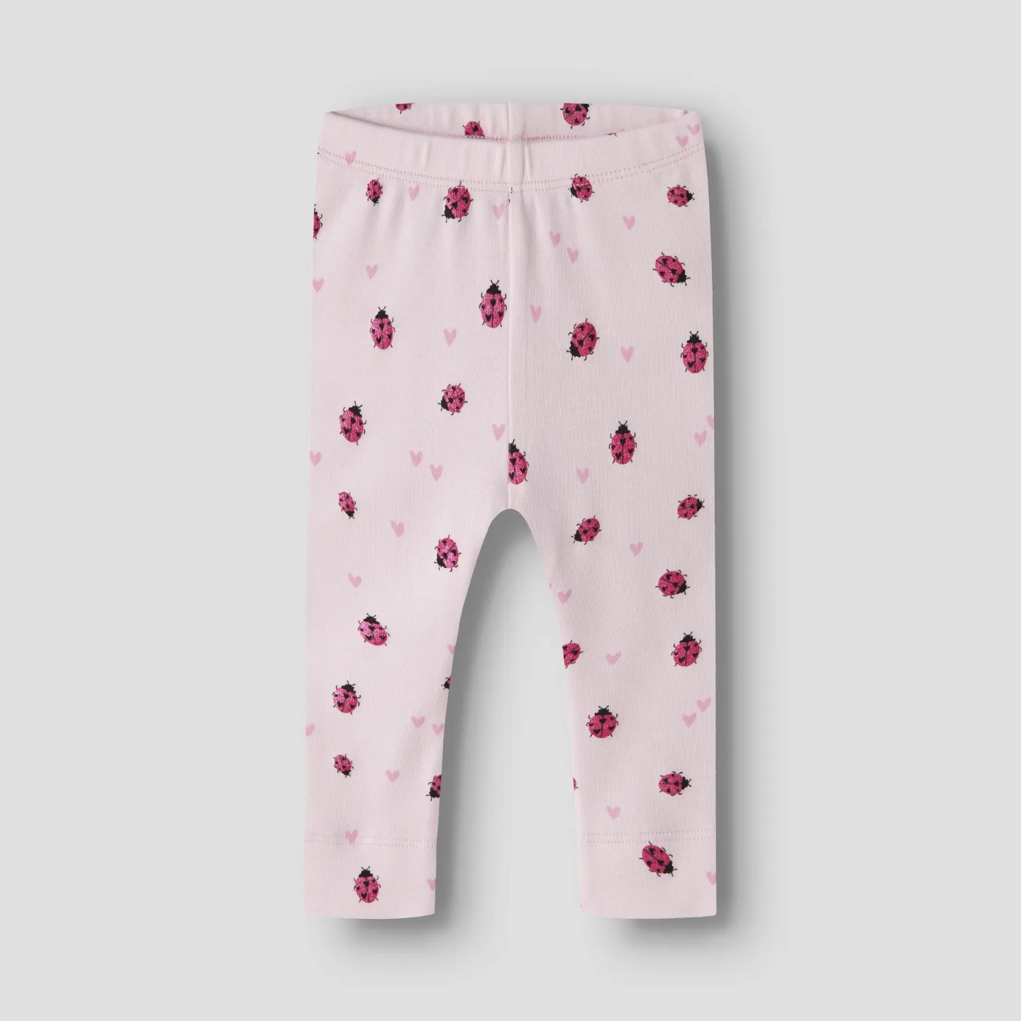 Name It leggingsene er i rosa med print af mariehøner med glimmer, samt rosa hjerter.