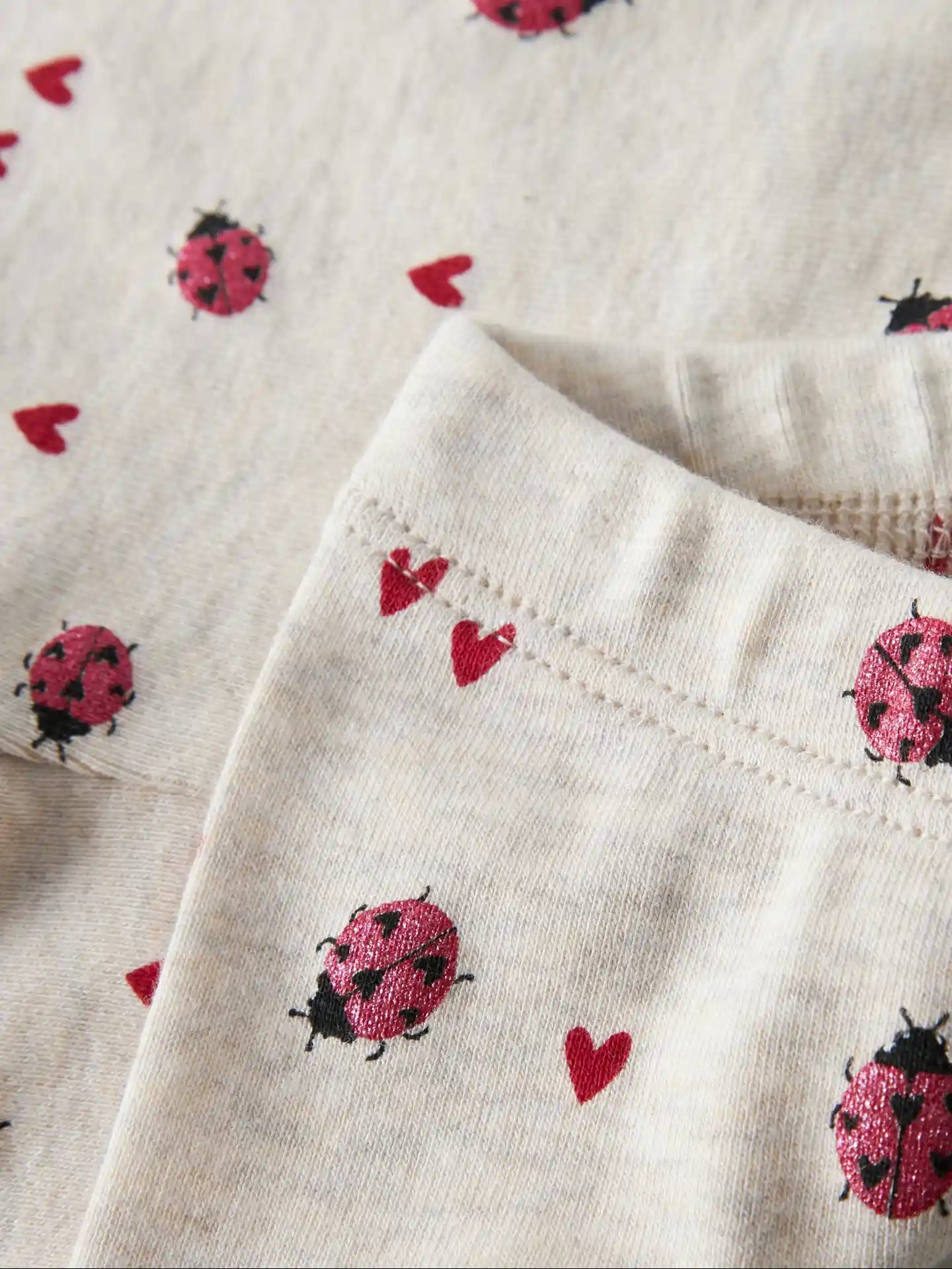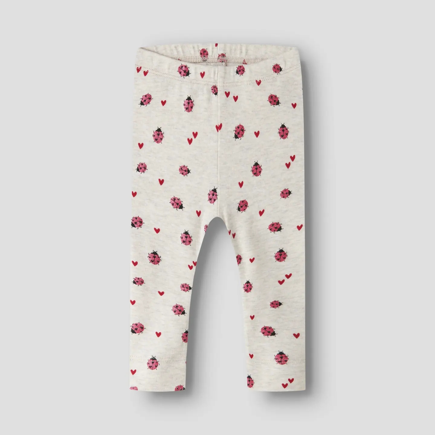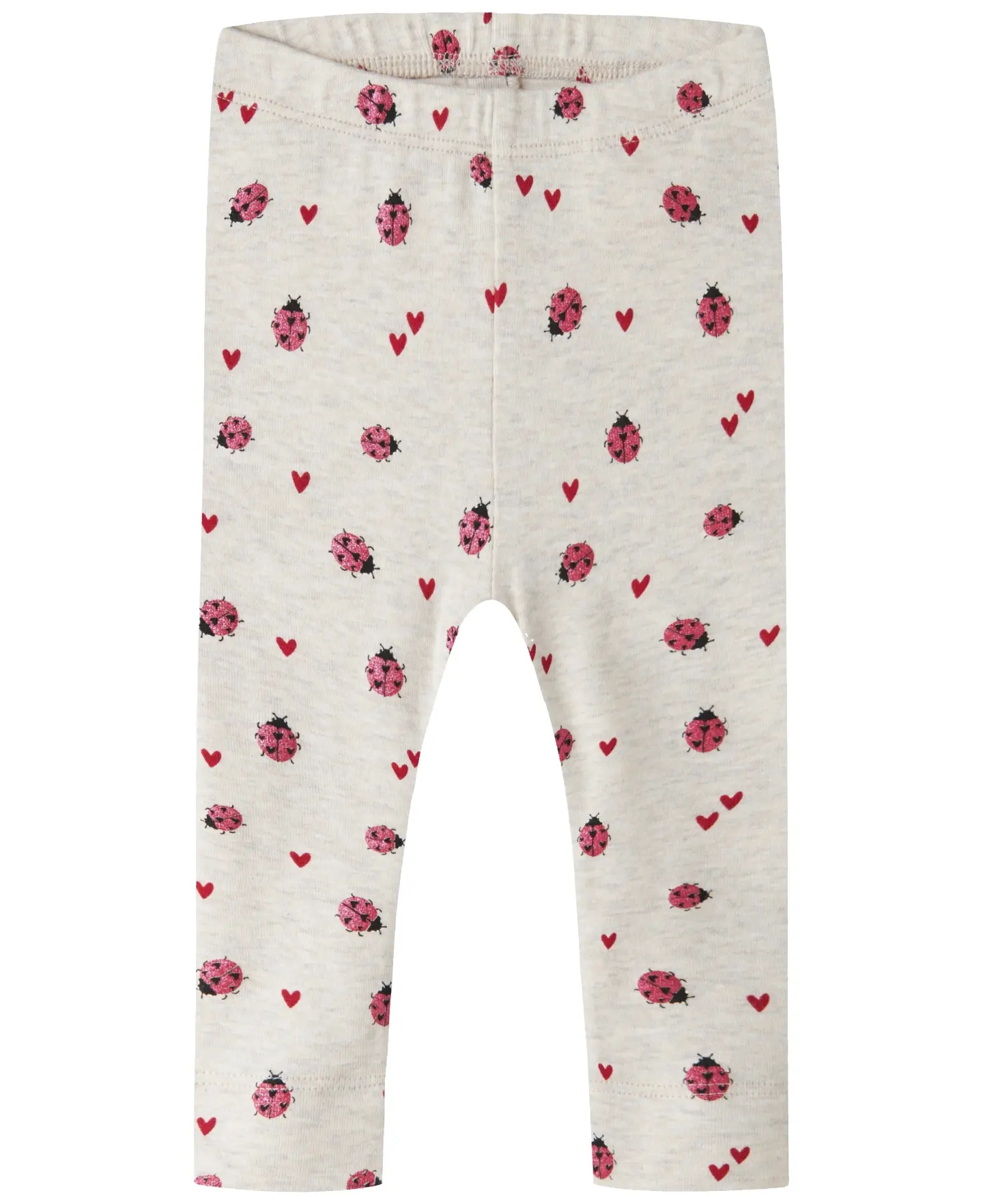 Name It leggingsene er i meleret beige med print af mariehøner med glimmer, samt røde hjerter.