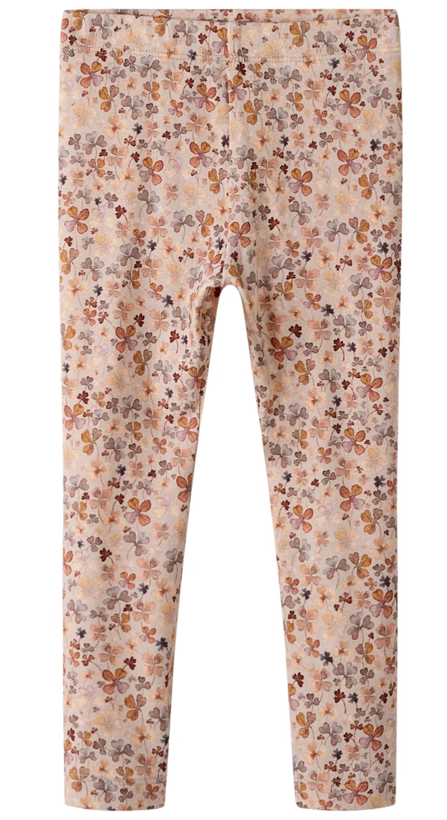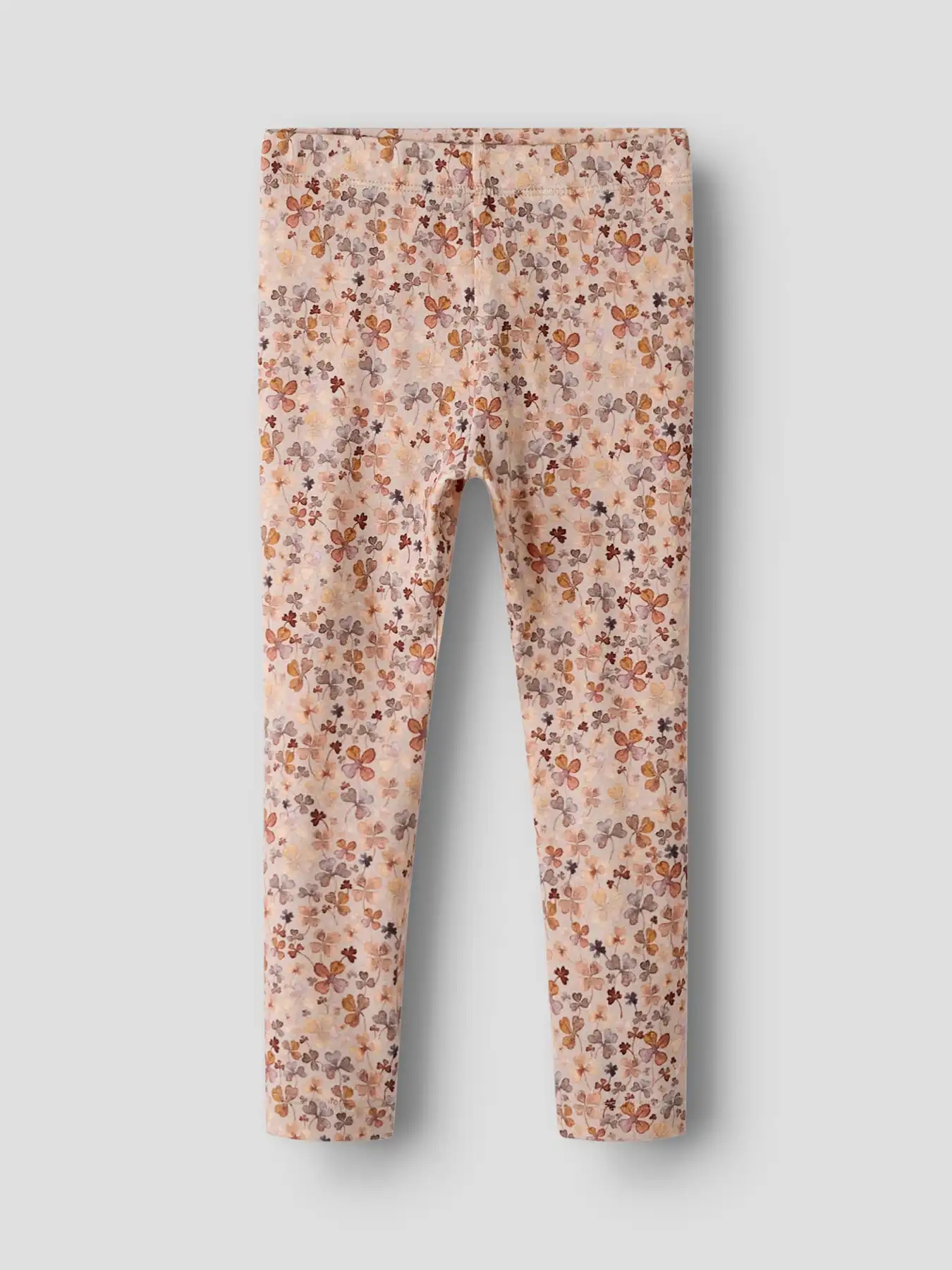 Dejlig bløde Name It leggings i en varm, lys farve med blomsterprint i skønne, gyldenbrune og lilla nuancer.