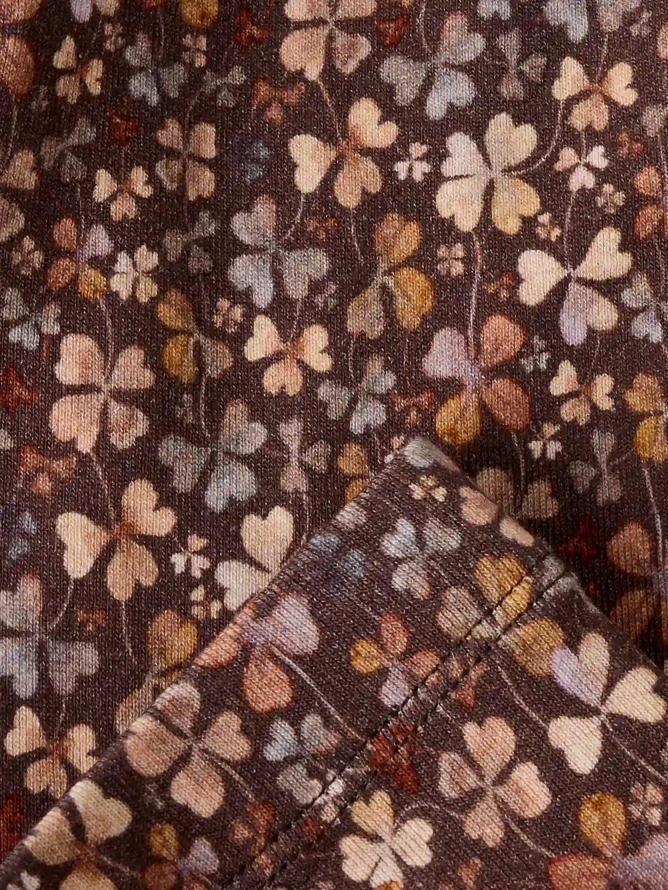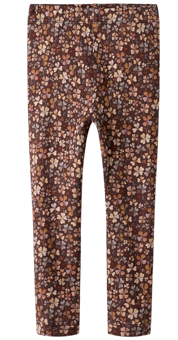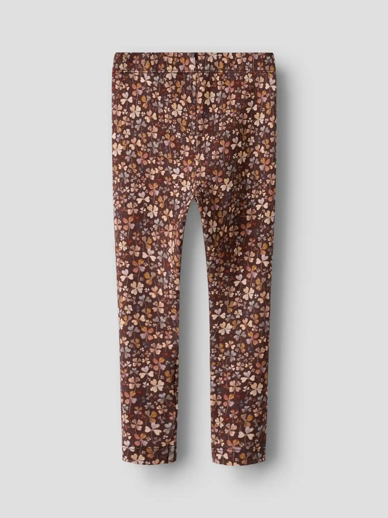 Dejlig bløde Name It leggings i en varm, brun nuance med blomsterprint i skønne, gyldenbrune og lilla nuancer.