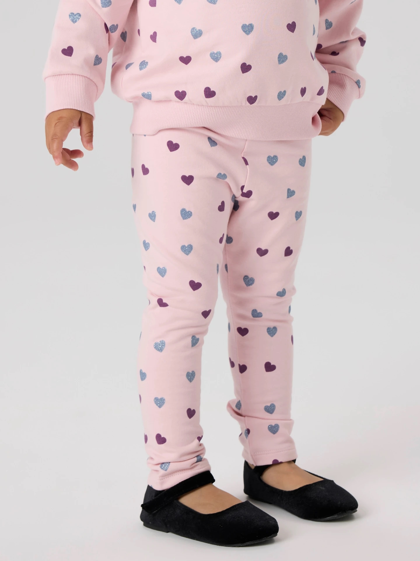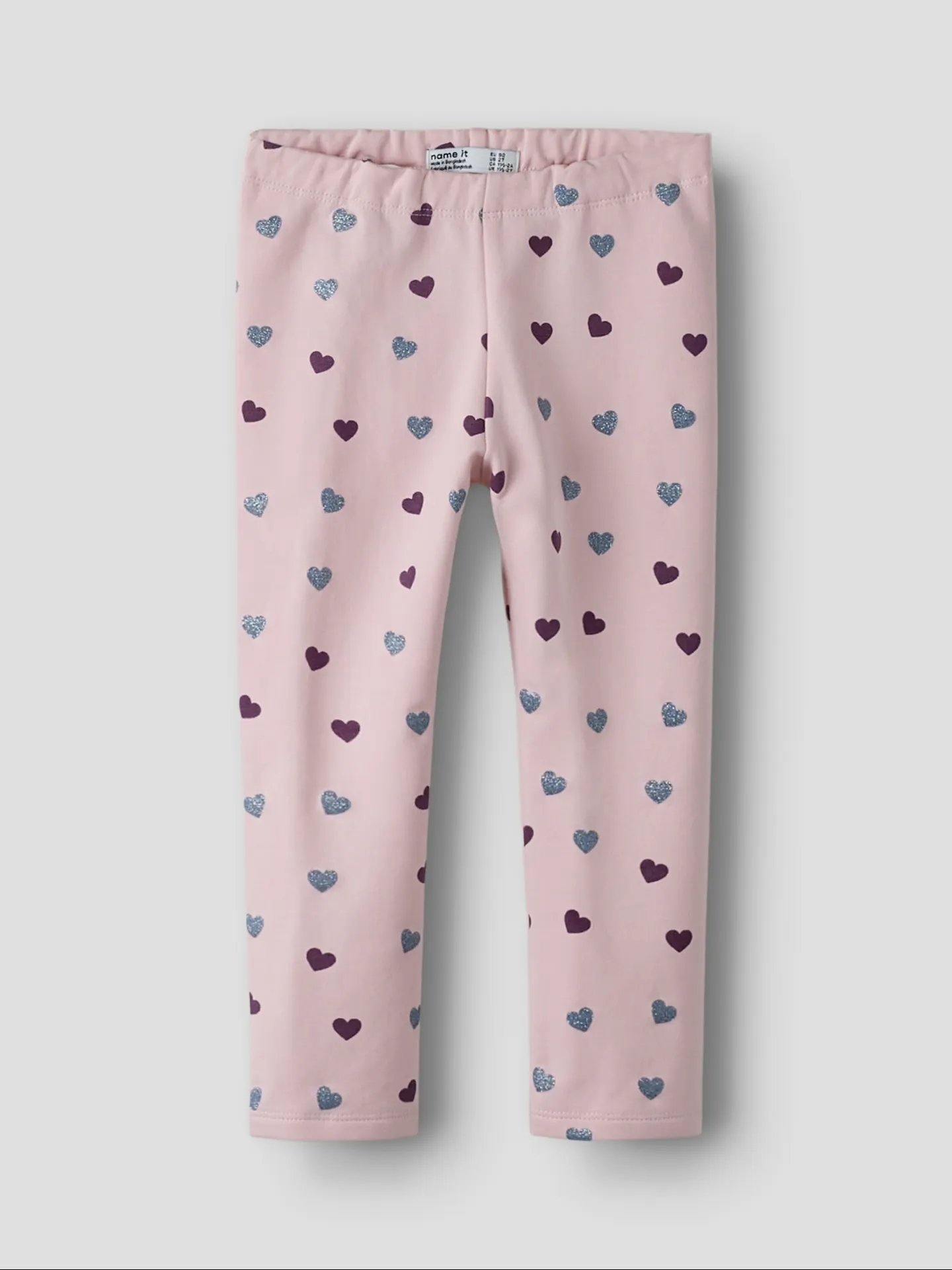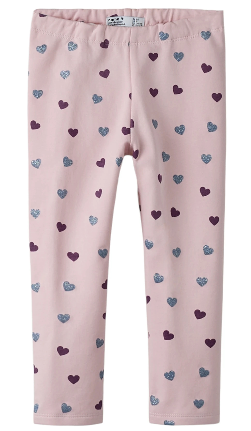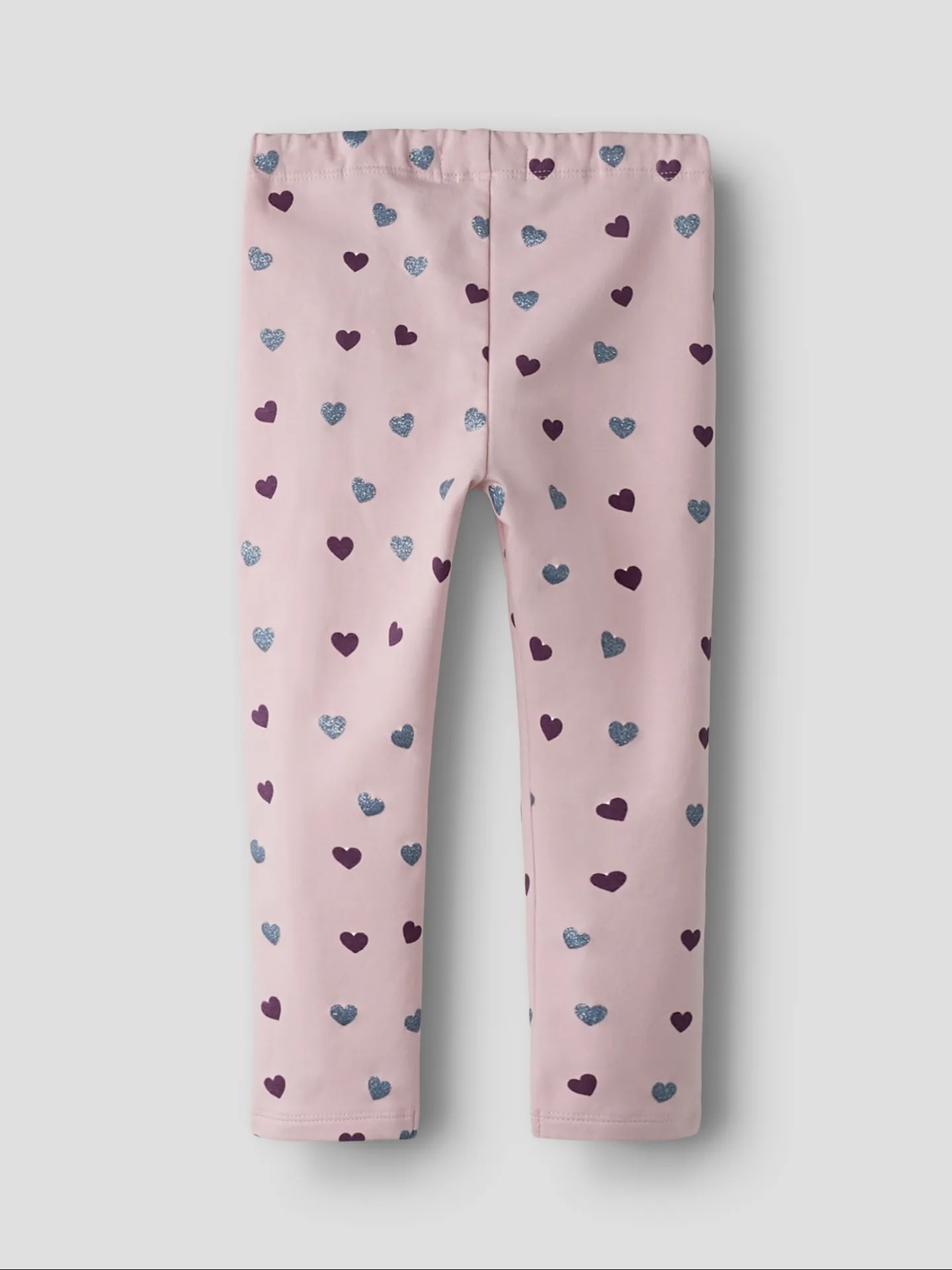 Leggingsene er rosa med rosa- og sølvhjerter. Sølvhjerterne er med glimmer, som giver dem et fint og sødt udtryk.
