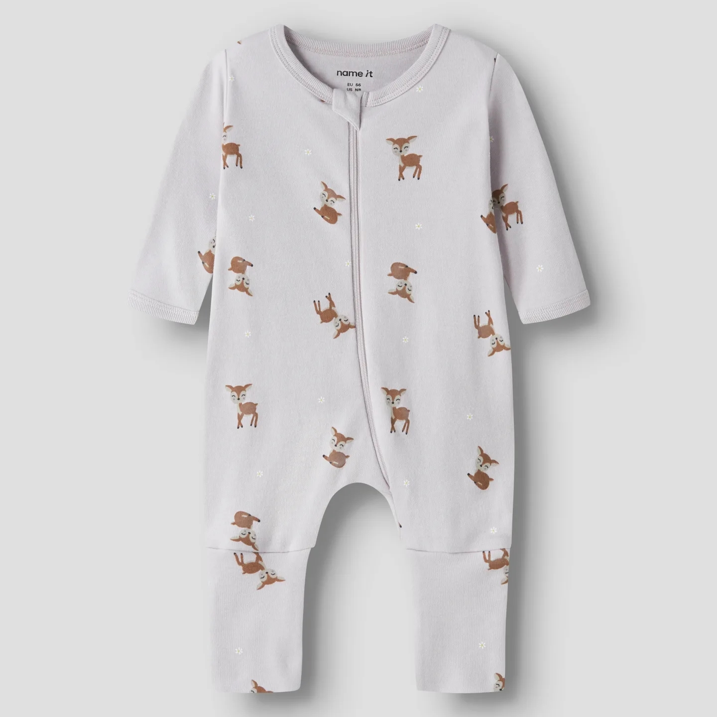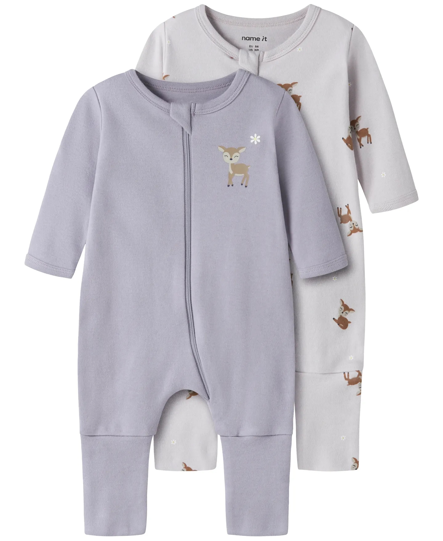Pakken indeholder to Name It natdragter. Den ene er i lys støvet lilla med all-over print af søde dådyr og små blomster, og den anden natdragt er støvet lilla med print foran af et sødt dådyr og en blomst.