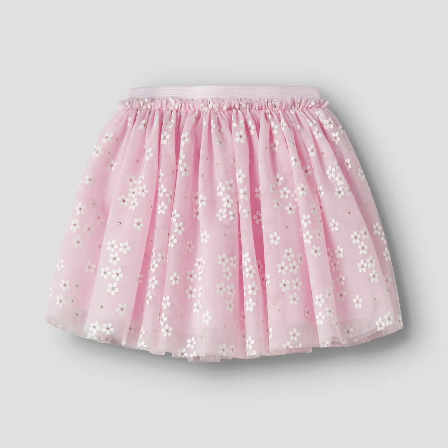 Name It nederdelen er rosa med broderede, hvide blomster med guldfarvet glimmer på tylskørtet. I taljen har den en rosa elastikkant.