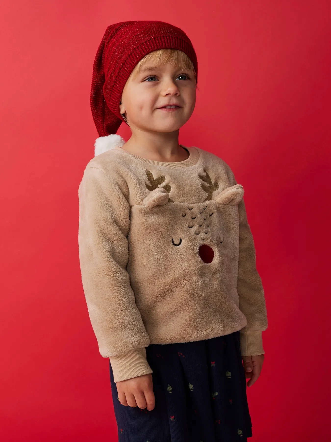 En sød Name It nissehue i rød med glimmer strikket i blødt bomuld.